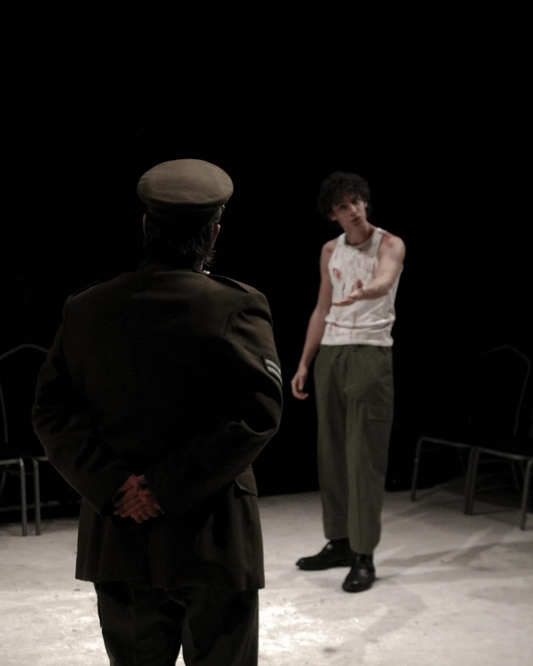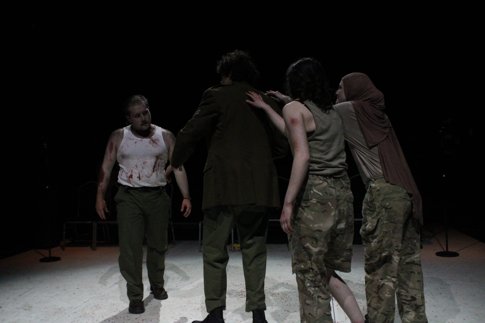 This production was such a profoundly strong offering, that I have to judge it not as a student production, but as a professional one. If I had any criticisms, it would be that there were a few tonal lapses. Firstly, with opening night running at 2 hours with no interval, the production slightly struggled to sustain its pace after the death of Duncan with a few of the quieter longer middle scenes beginning to drag slightly. Another tonal inconsistency was through its use of movement. While the opening movement sequence was convincing in isolation, effectively demonstrating a war-torn environment, it clashed with the rest of the play’s artistic style. The same could be said for the Banquet scene’s slightly dated and trivial parlour dancing which again differed from the hyper-cool technological mind of the rest of the production. Finally, whilst the Witches were well conceptualised and incredibly powerful especially in their uncanny miming to the soundscape and physical embodiment, some of the character direction felt slightly traditional and less sophisticated than the rest of the high-concept production. It seemed to lean into vaguely creepy tropes, i.e. creepy laughing, as opposed to what could have been the interesting angle of the dead soldiers. That said, their role in the play’s ending is beautifully chilling.