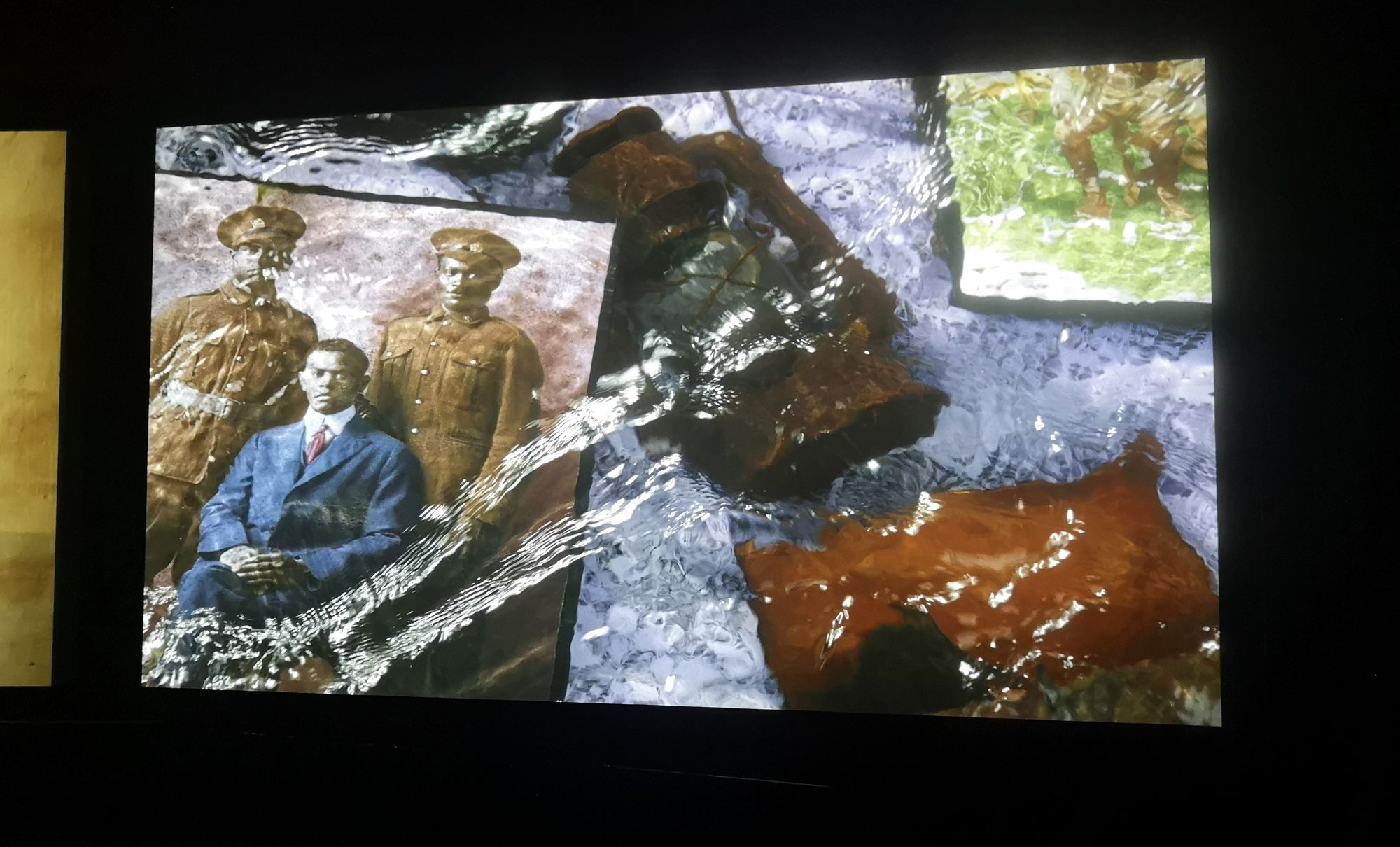 The film takes the viewer on a chronological journey of the Africans who travel from their homes to France, segmented by black and white original footage. Throughout this, Akomfrah uses water in a striking and unusual way. One of the opening scenes which recurs throughout is of a collection of African soldiers’ belongings, such as a photograph, a blanket, and an instrument with water running over it. Left wondering the significance of these objects, I found this imagery of water not only gave an extraordinarily beautiful effect but left a sense of ambiguity. Are they the objects brought with the African men to France and then tossed into a lake after their death? Or are they meant more metaphorically as a collation of tangible objects that made up their lives, to highlight the pitiful sadness of what is left of them after they’re gone?
