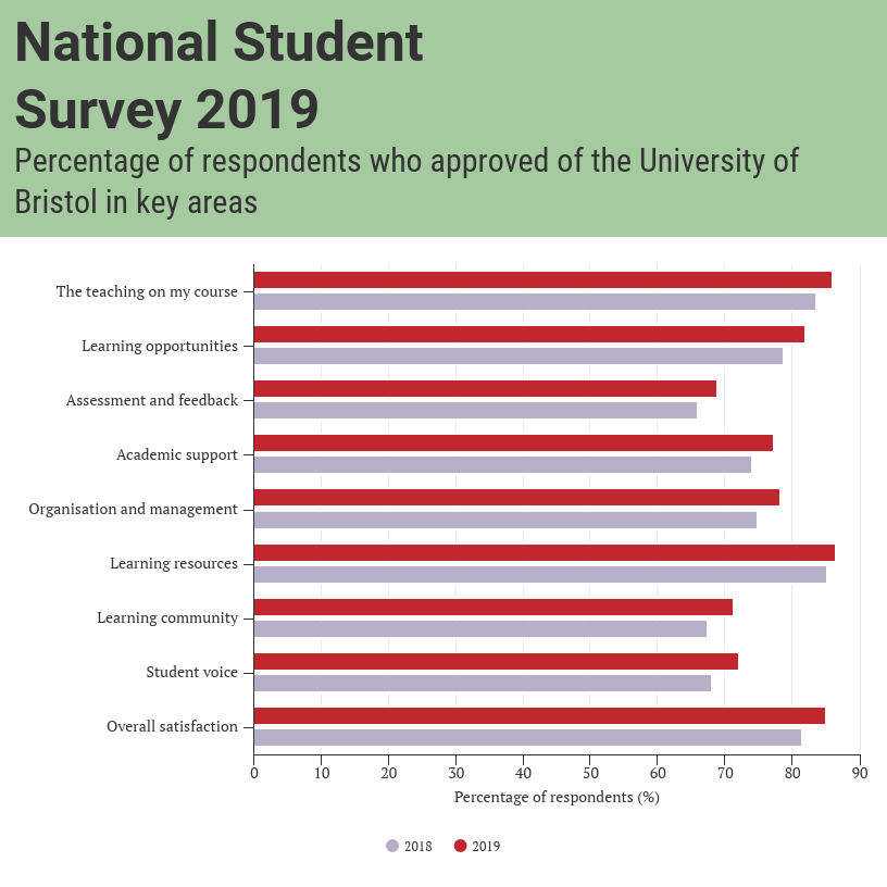 According to the NSS, which takes annual findings across all UK higher education institutions, the University of Bristol scored one per cent higher than the overall sector average.