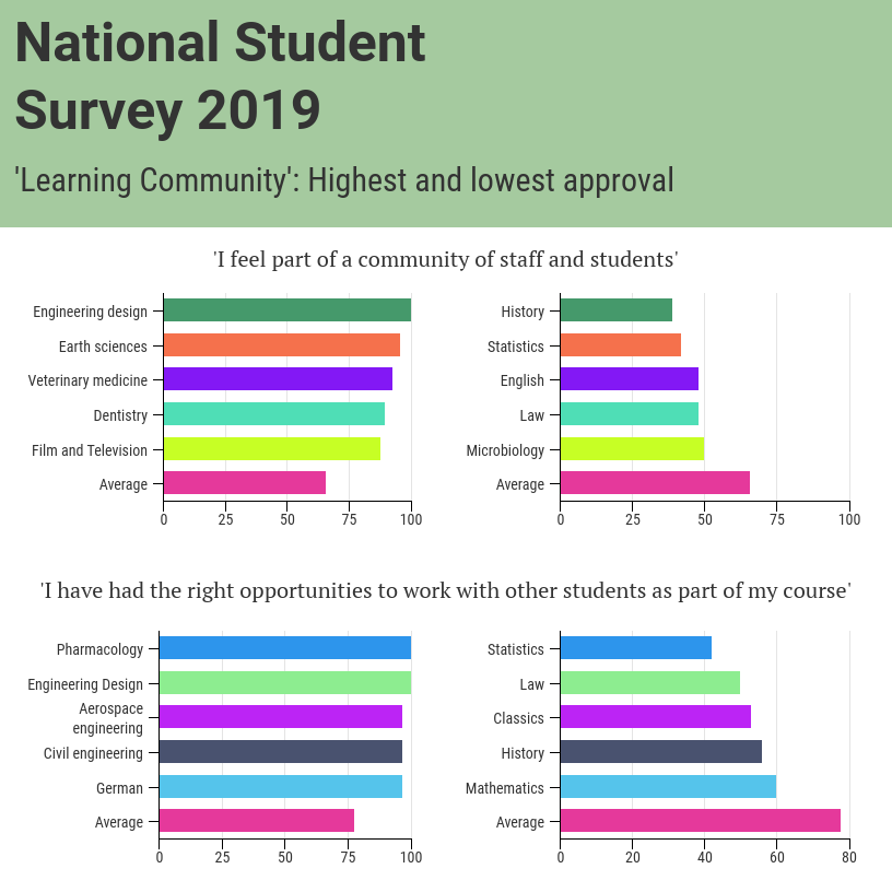 Other aspects of University life did not receive such high scores, with 65 per cent of students saying that they ‘feel part of a community of staff and students’ and 67 per cent agreeing with the statement that they ‘have received helpful comments on work’.