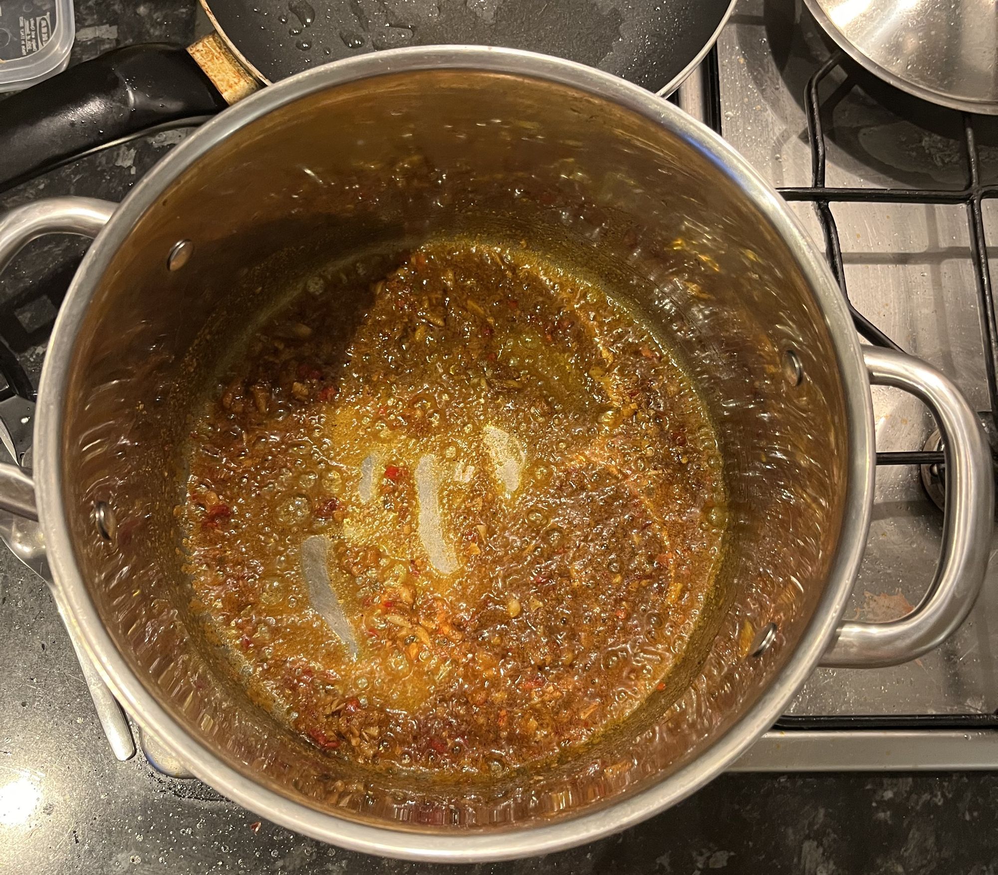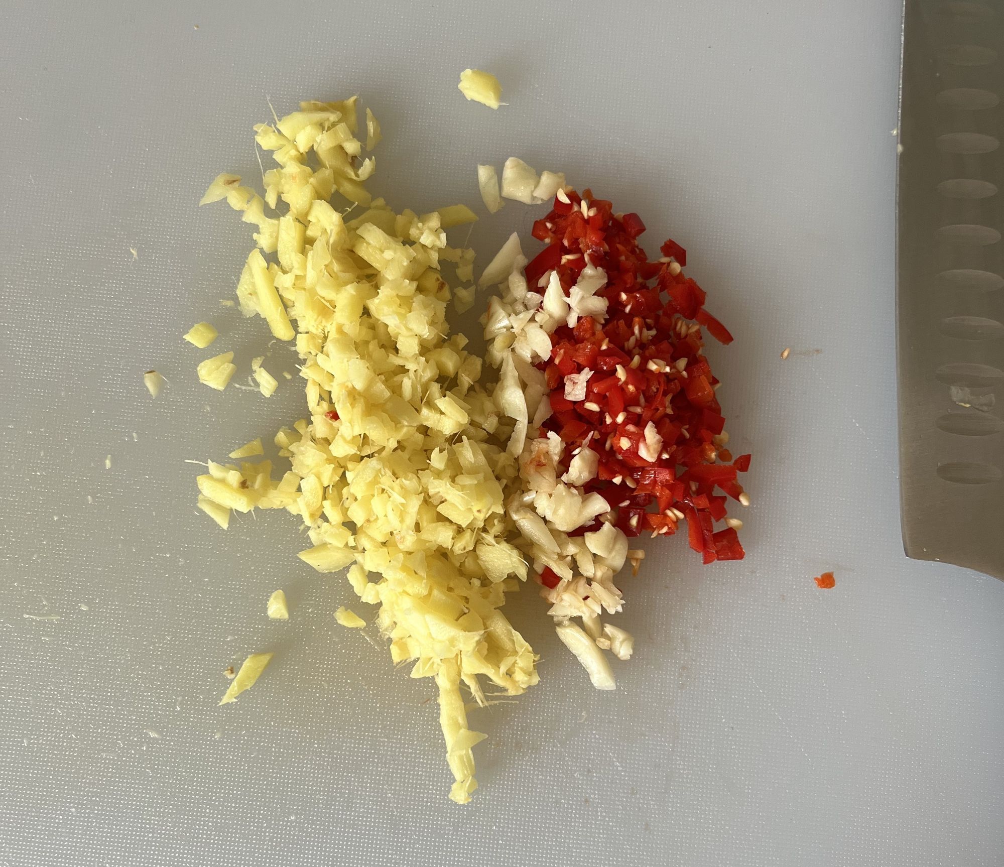 I chopped up two cloves of garlic and a chilli (I would’ve put half an onion in as well but as previously mentioned, the cupboards were pretty bare). I also had a bit of ginger I grated into this mix. I fried all of that off in a large pot for a few minutes with a couple of teaspoons of curry powder and a little bit of curry paste and then added in the veg. The stalk of the broccoli doesn’t look quite as good as the florets but is still really good for you and reduces your food waste, so I cut that into matchsticks and chucked it in with three chopped mushrooms. This was just what I had in my fridge, but you could use any vegetable here really: carrots, peppers, cabbage and Bok choi would’ve all worked well in this.