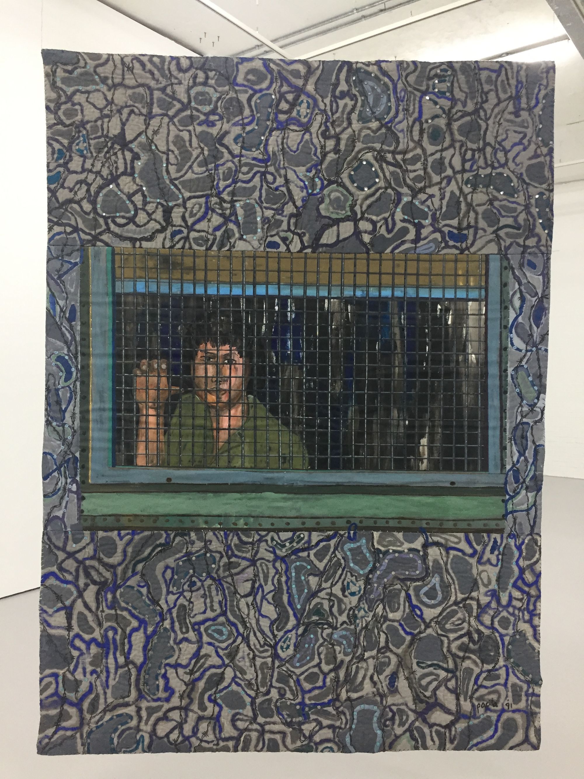 An immigrant herself, Pacita Abad felt a responsibility to offer her own perspective. Combining social realist imagery with her trapunto technique, Abad portrays the multifaceted nature of immigrant life in the United States. Caught at the Border (1991) depicts a scene we are uncomfortably familiar with: a woman incarcerated at a detention centre. We learn from the short video documentary on show at the exhibition that the artist herself was put in customs detention for a night in Hawaii for no reason other than bearing a Filipino passport. Regrettably nearly thirty years on, such images continue to permeate visual media.