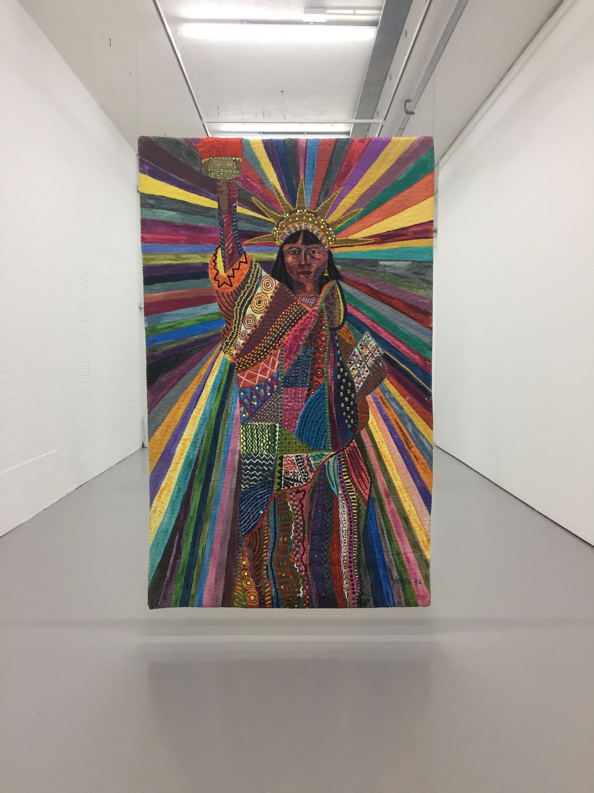L.A. Liberty (1992) recasts the Statue of Liberty as a woman of colour wearing a patchwork robe adorned with plastic buttons, broken glass and golden thread. In the background, a powerful rainbow of colour radiates from the woman’s head filling the canvas with dazzling hues. Abad’s work reimagines the icon of freedom and the American Dream to reflect the ethnic and racial diversity of the country’s immigrant population, paying homage to all American immigrants of colour.