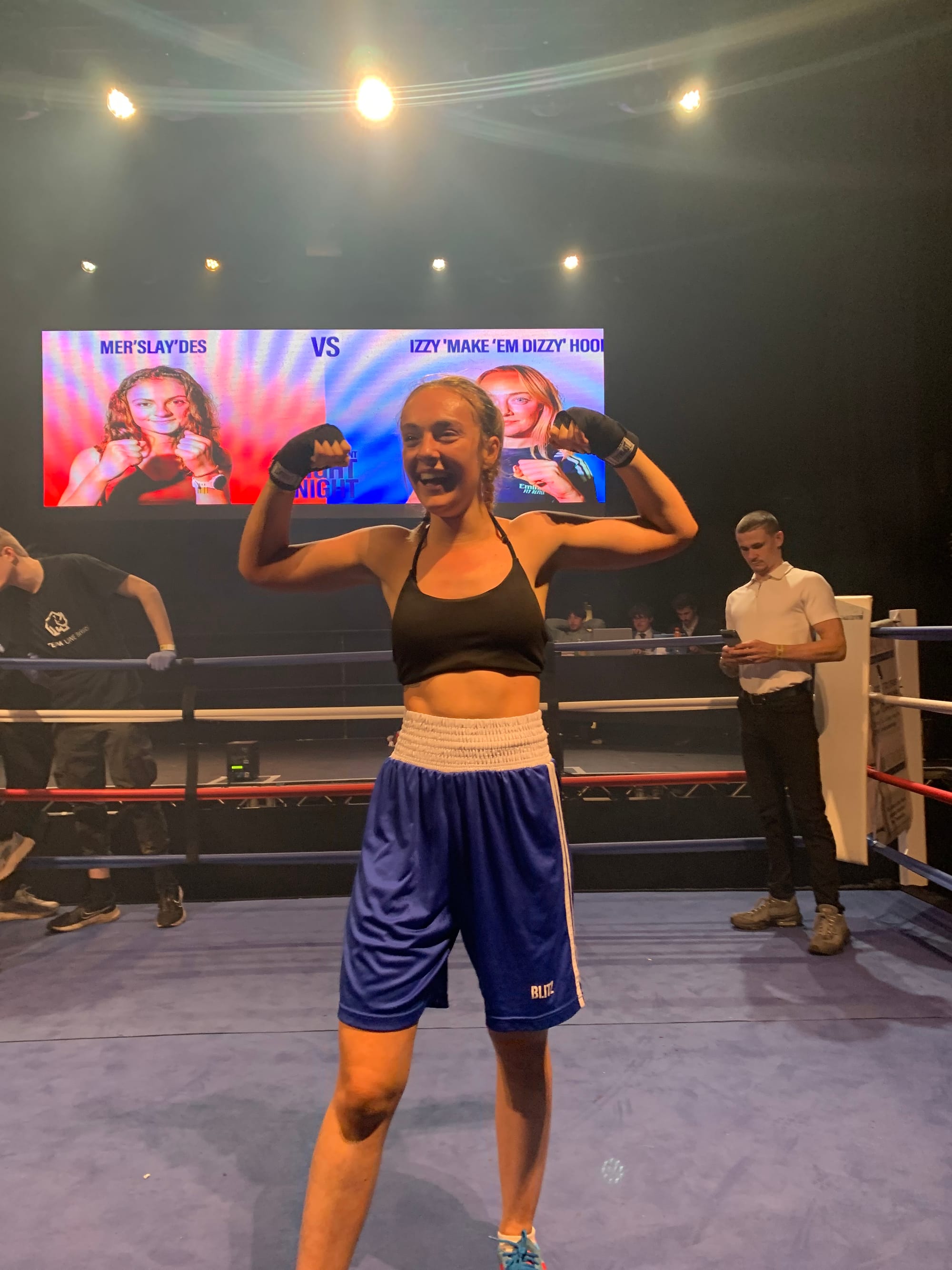 19:04 - Technical Knockout! 'Make 'em Dizzy' does just that! The second round continued much as the first and Izzy Hood celebrates in front of her fans. Hood ran the show from the off and eventually the referee was correct to call it an end early.