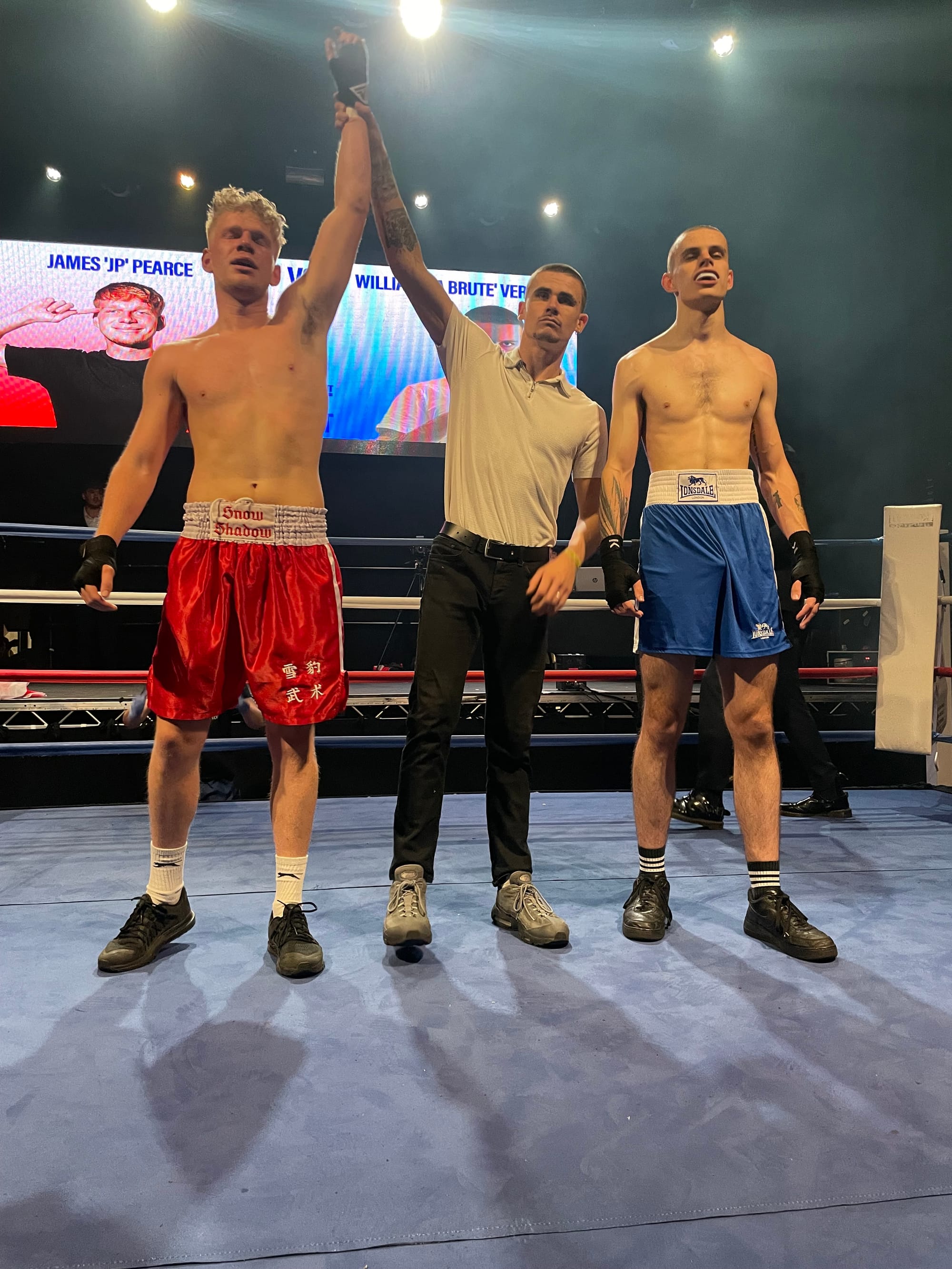 20:47 - Fight 12: 'The Battle of Britain'. In the red corner steps out James 'JP' Pearce for UWE, while Frenchman and BIMM student, William 'La Brute' Vergonnet files into the blue corner. Both fighters look angry so I think we can expect that to show.