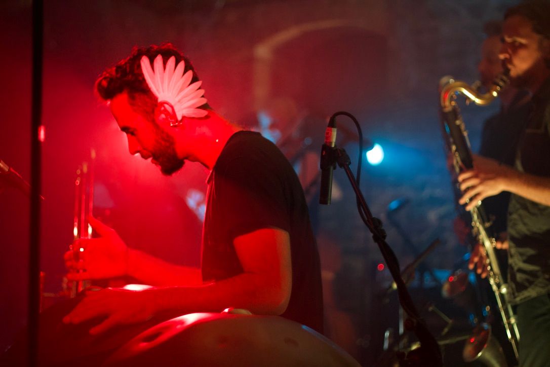 The entire space suddenly plunged into complete darkness. One by one, the nine highly talented musicians made their way onto the brooding stage, with a soothing, choral loop crooning in the background. Amidst frantic flickering of head torches worn by the band, at times dizzying, they kicked off the spellbinding show with an impressive, slightly disquieting opener; a boisterous trombone blaring out short snappy notes alongside a thumping drum beat with some clashing violin notes. The whole night was brimming with mindblowing melodies and experimental rhythms, all juggled evenly between the varied instruments.