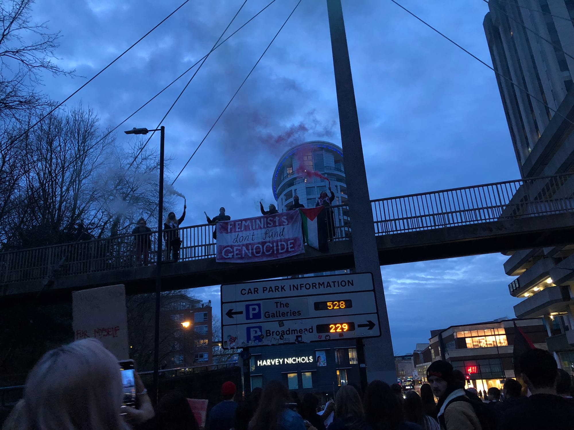 Therefore we answer the call from Palestinian feminists to resist our government's collaboration with Israel in the ongoing genocide. We stand in solidarity with all who disrupt the violence of Imperialism - from Bristol to Palestine, West Sahara to Kurdistan, Congo to Sudan - we rise together, united in resistance.’