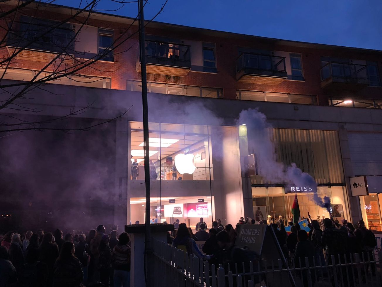 Afterwards, attendees marched through Bristol city centre. Chants of ‘free Palestine’ and ‘occupation no more’ could be heard among the crowd, with some releasing smoke flares into the sky. Protestors stopped outside businesses including H&M, the Apple Store, Barclays and McDonalds chanting ‘shame on you’ and calling for boycotts. One protester said that drinks were thrown on them during the march.