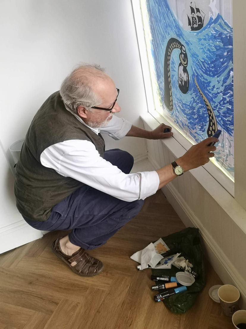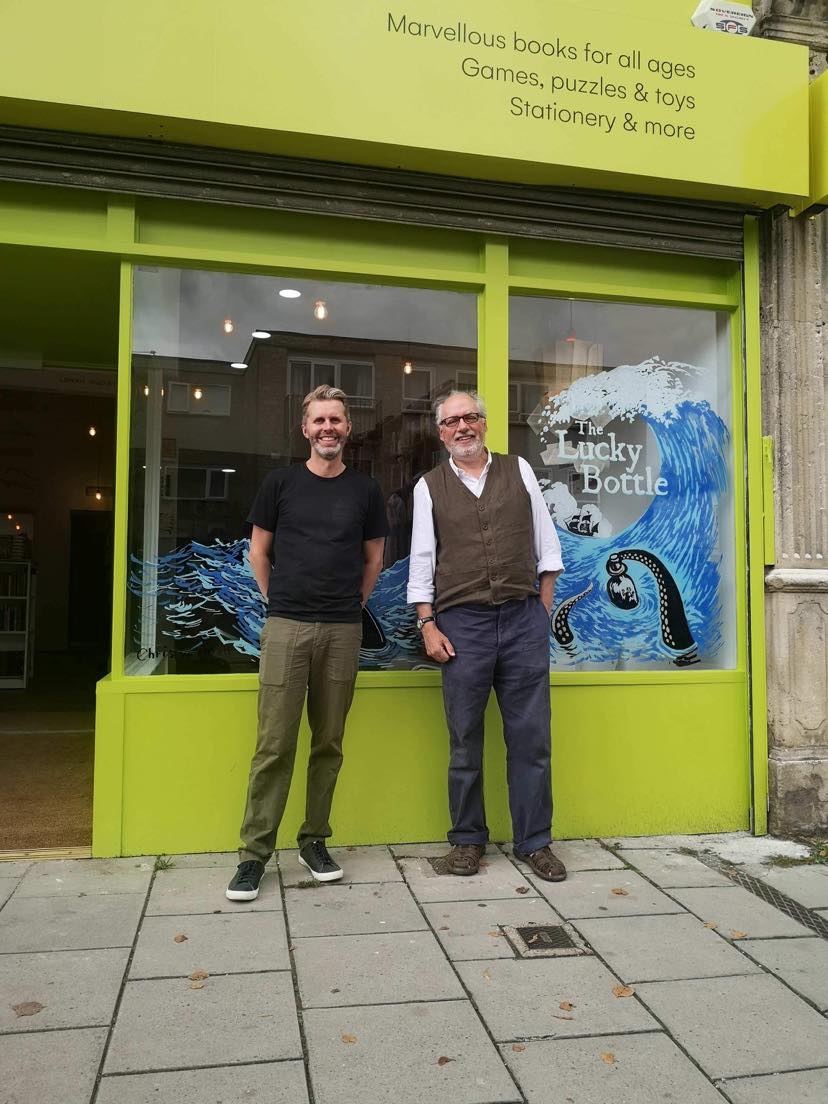 As I was leaving I happened to catch a glimpse of the celebrated author and illustrator, Chris Wormell, who was painting a mural on the front window. I was mesmerised by the slick brush strokes of the master illustrator who was painting some unruly waves in blue. His latest book The Lucky Bottle was proudly on display. By the time I stepped outside, Wormell had finished his mural and it was a delight.