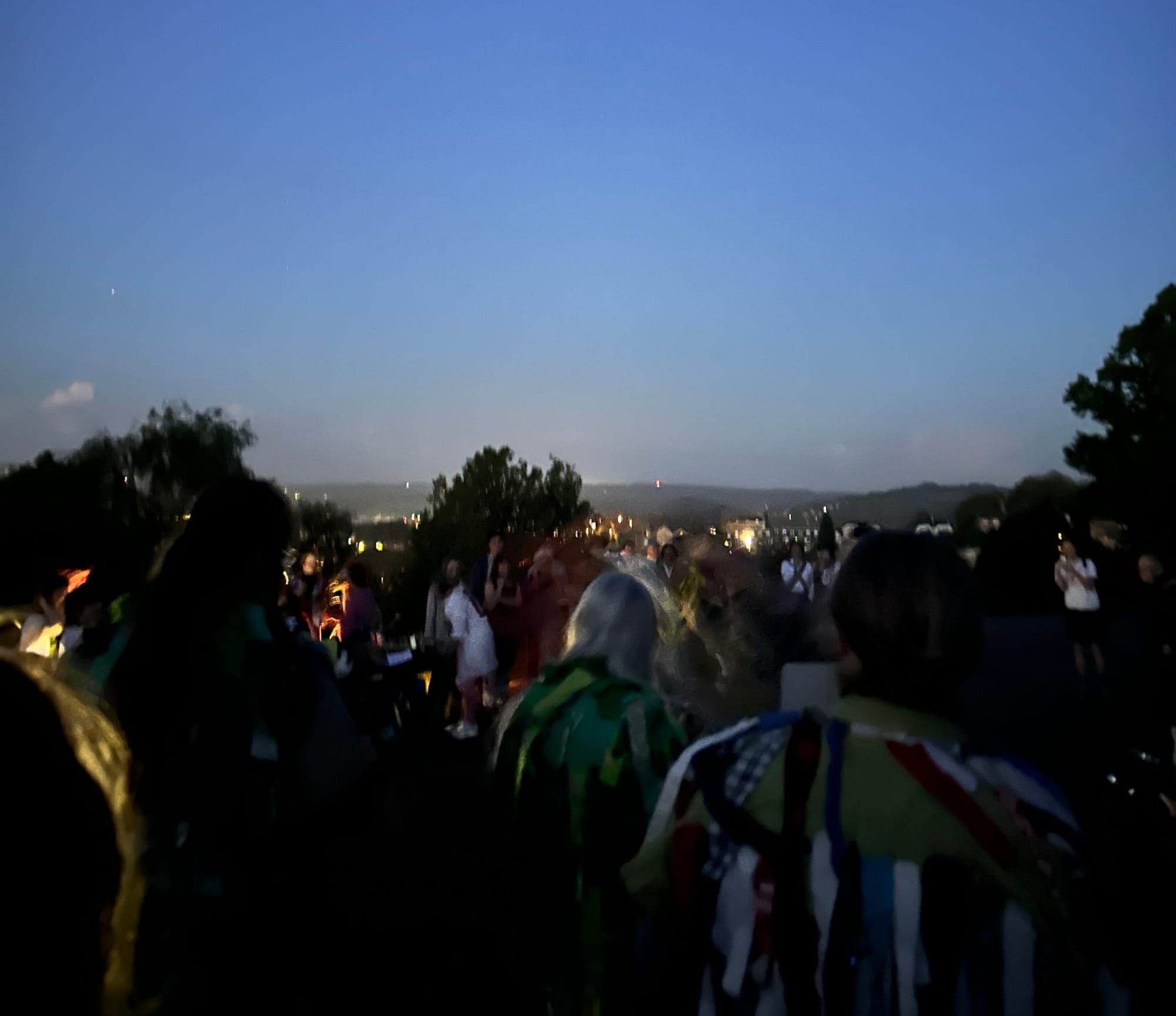 Bus timings meant that my flatmate and I were a little early to the May morning affairs, so we sat on a bench in the dark as we awaited the promised meeting time of 4:30AM. The jingling of approaching bells, growing in volume as dancers walked towards us up the hill, was a comforting sign of human life in the before-dawn black.