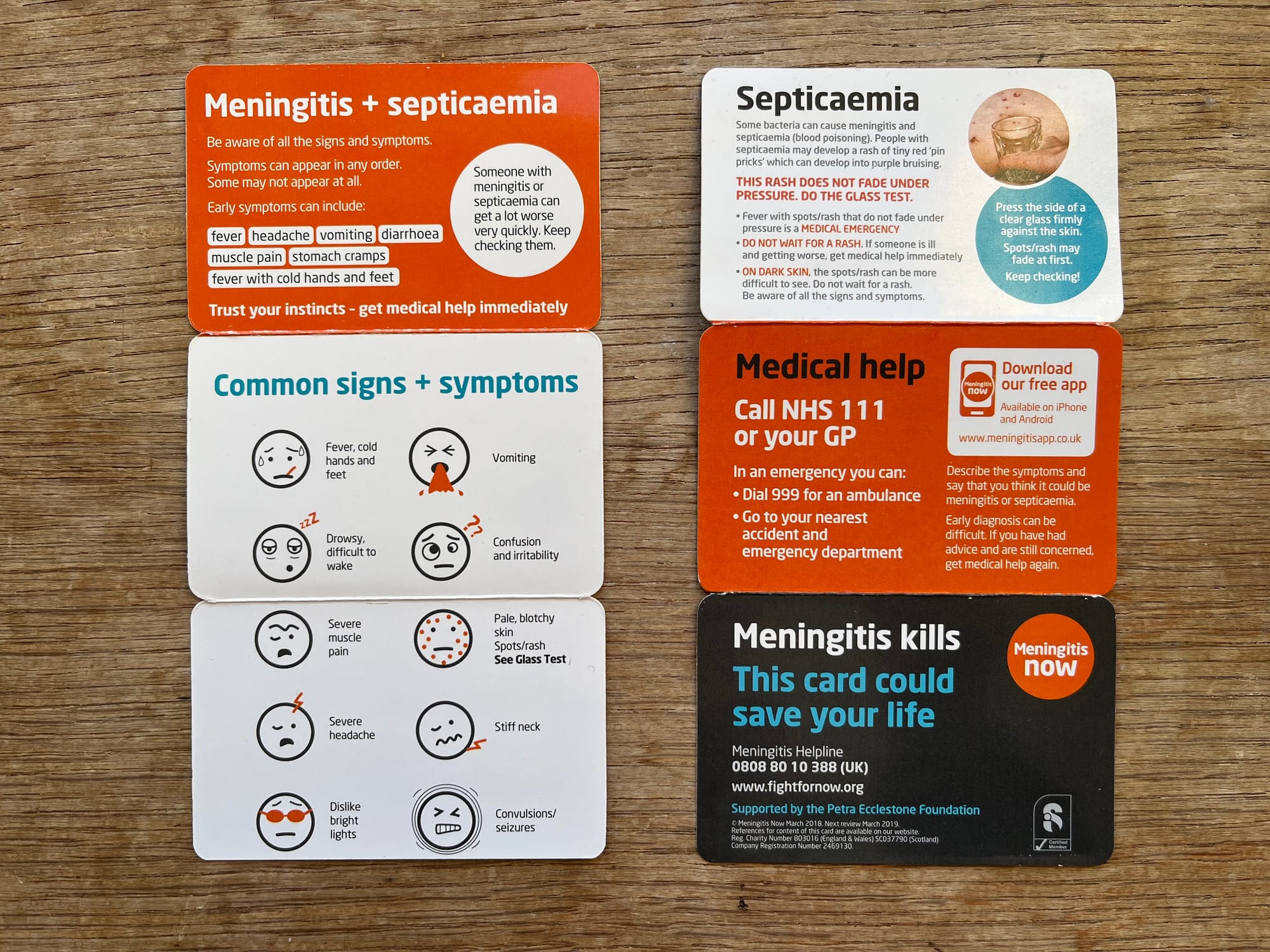 Call 999 immediately or go to your nearest A&E if you think you or someone in your care could have meningitis, septicaemia or sepsis. Trust your instincts and do not wait for all symptoms or for a rash to develop. People with meningitis, septicaemia or sepsis can become seriously unwell very quickly. Call NHS 111 if you're unsure whether it's serious. If you've already had medical advice but remain worried or symptoms worsen, seek medical help again.”