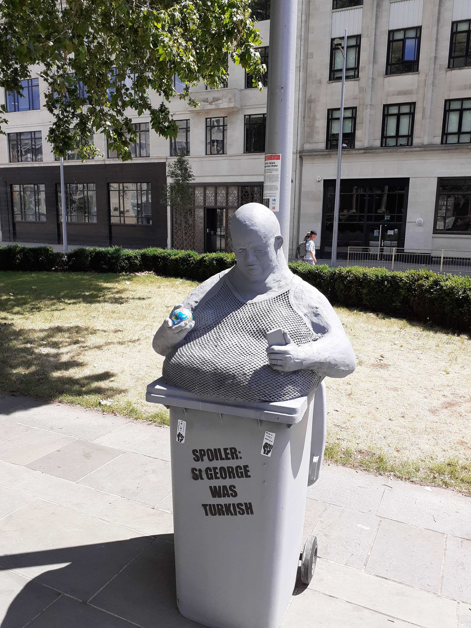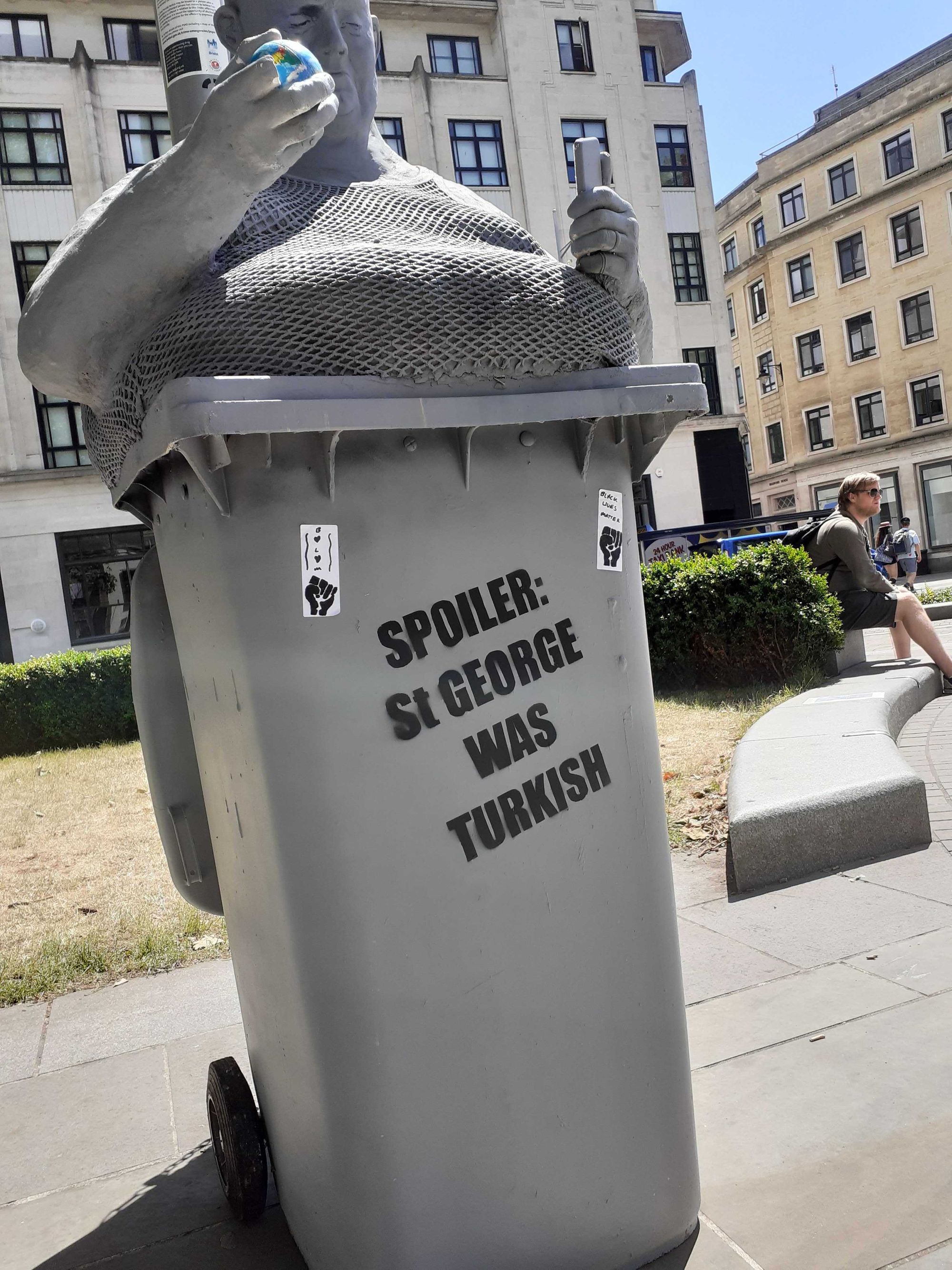 Holding a small, coloured globe in one hand and a mobile phone adorned with the St George flag in the other, which reads ‘England for the English,’ the statue also displays the inscription ‘Spoiler: St George was Turkish’ on its front.