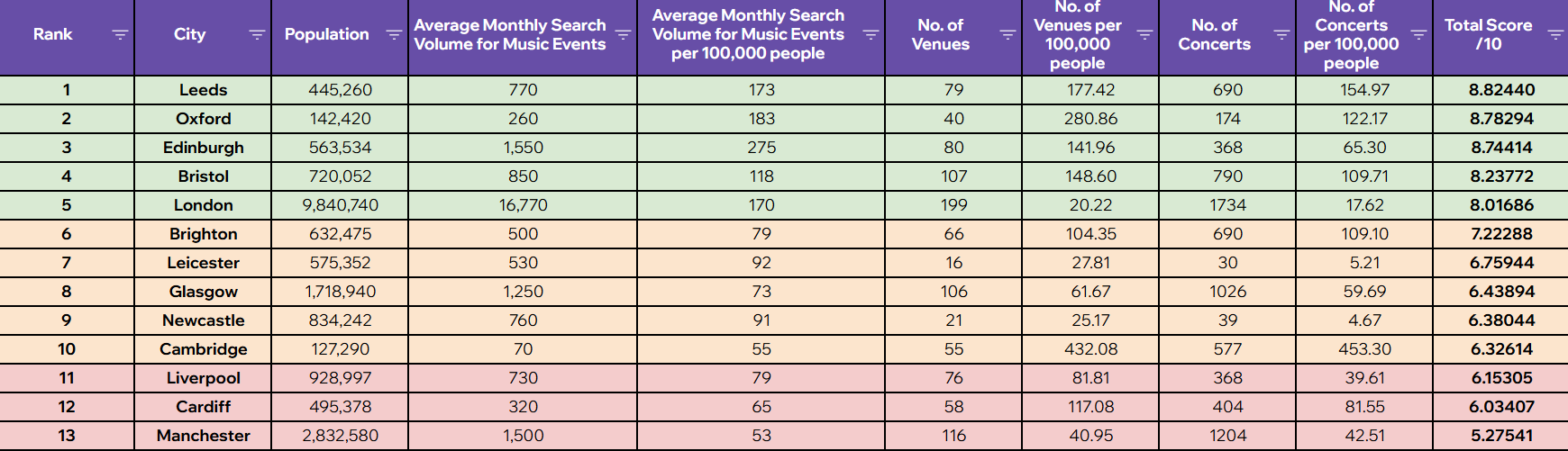 A score for each city out of ten is calculated by considering Google Ads to gather average monthly search volumes for terms like ‘concerts’, ‘gigs near me’, ‘live music’, ‘music festivals’, and so on.
