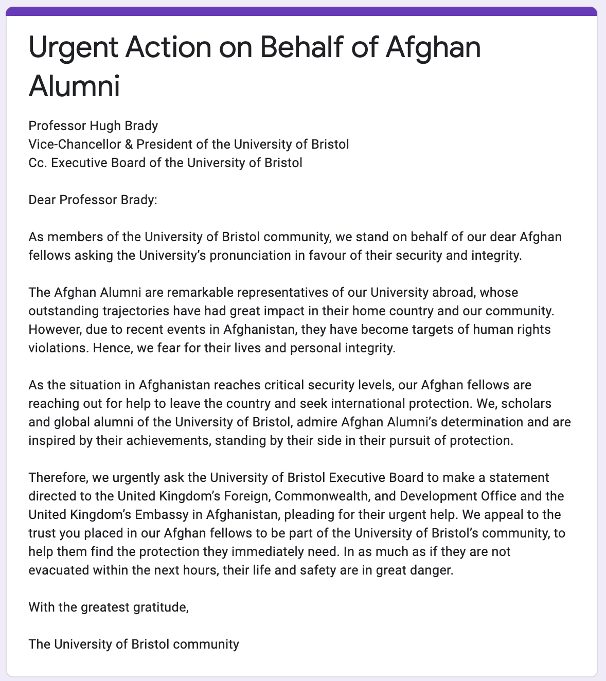 Firstly, you can submit this pre-written letter to the Vice-Chancellor and President of the University in support of an urgent appeal on behalf of Afghan alumni asking the University of Bristol’s Executive Board to make a statement directed to the United Kingdom’s Foreign, Commonwealth, and Development Office and the United Kingdom’s Embassy in Afghanistan, pleading for their urgent help.