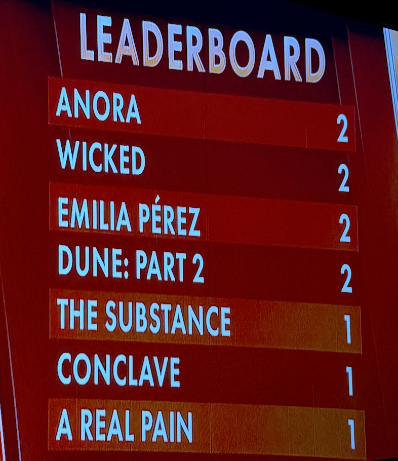 03:35- The current leaderboard as it stands before our final two awards: Anora is tied with The Brutalist at 3 wins, with Wicked, Emilia Perez, and Dune 2 tied at 2 wins following closely behind.