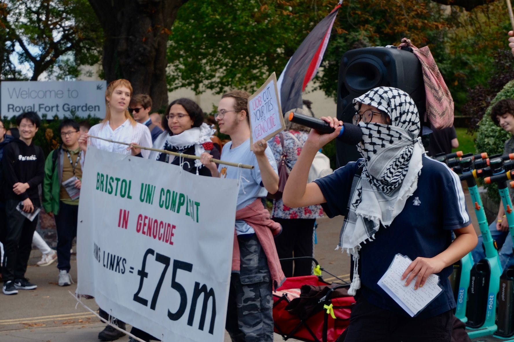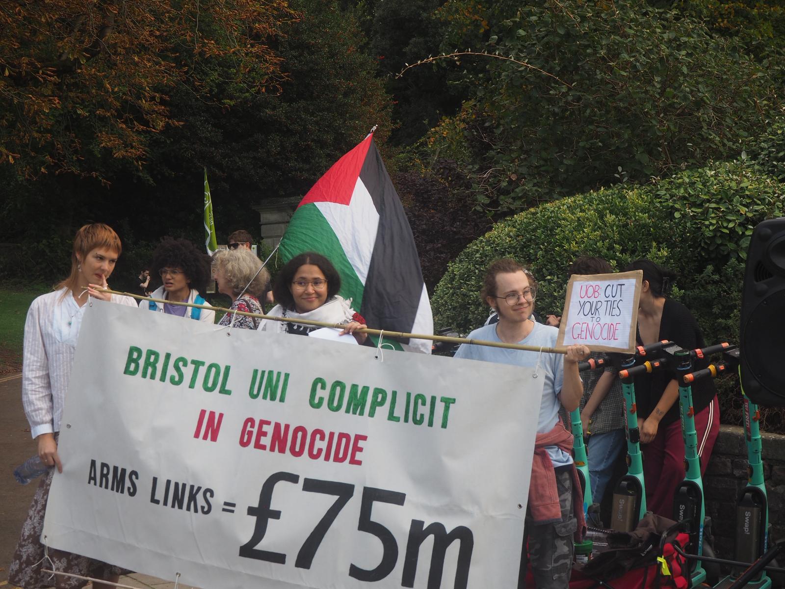 A pro-Palestine rally took place in front of the Royal Fort Gardens by Senate House, today 24 September at 12.30pm, in protest against the University’s research partnerships and investments in defence companies currently suppling Israel's military action in Gaza.