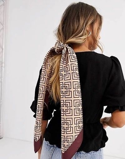 From floral designs to monogram squares, this polysatin ASOS monogram scarf has a French chić look with an added modern element to its geometric design.