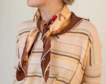 Etsy has a great range of vintage silk scarves to choose from. This handkerchief has a country vibe with its brown tones and equestrian print. Checking out the local charity shops is also sure to secure you a vintage bargain for one of these unique accessories.