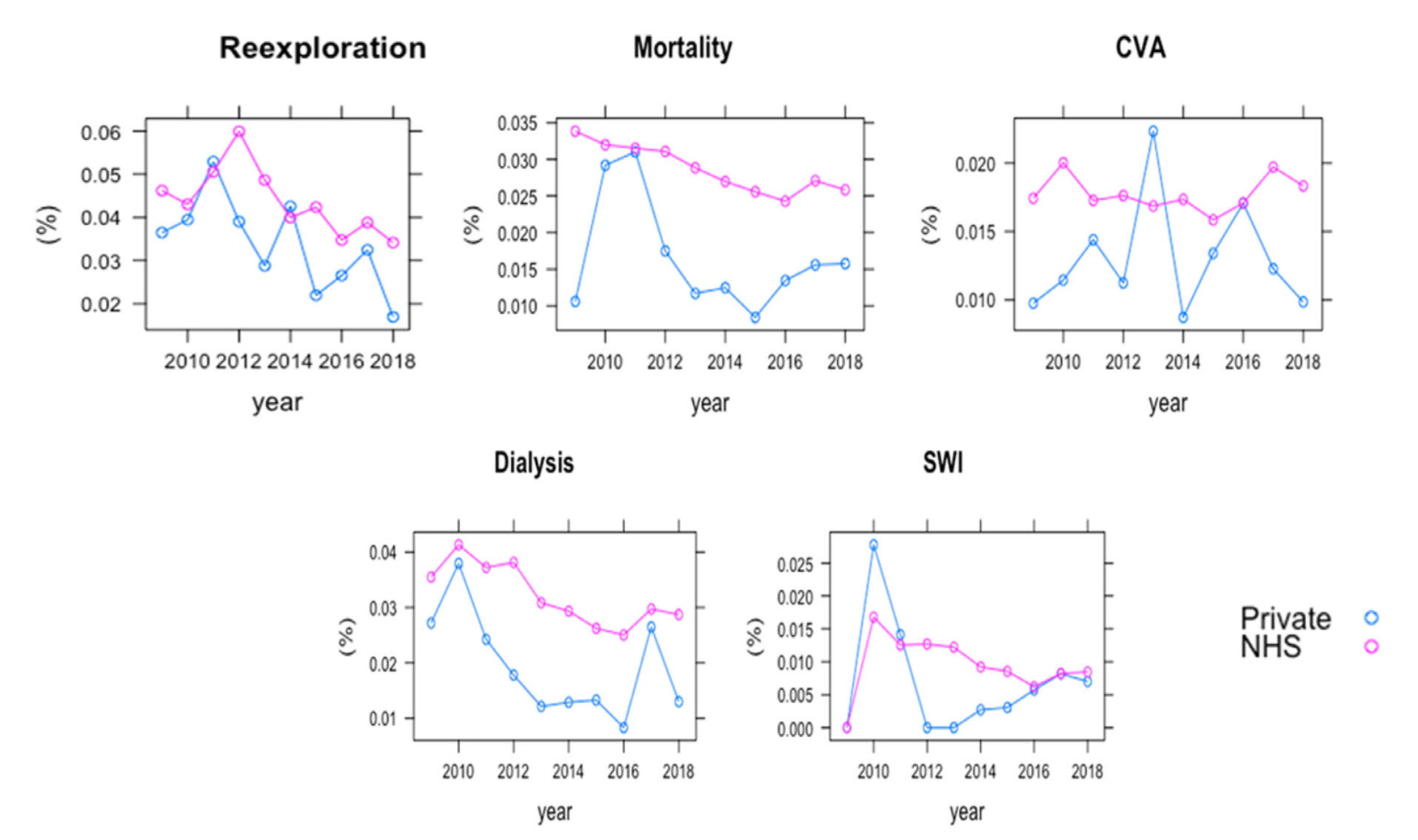 Private payers (blue line) may have experienced a lower incidence of mortality and post-operative complications (re-exploration, cerebrovascular accidents [CVA], dialysis and sternal wound infection [SWI]), compared to NHS patients (red line) | The Lancet / Benedetto et al.