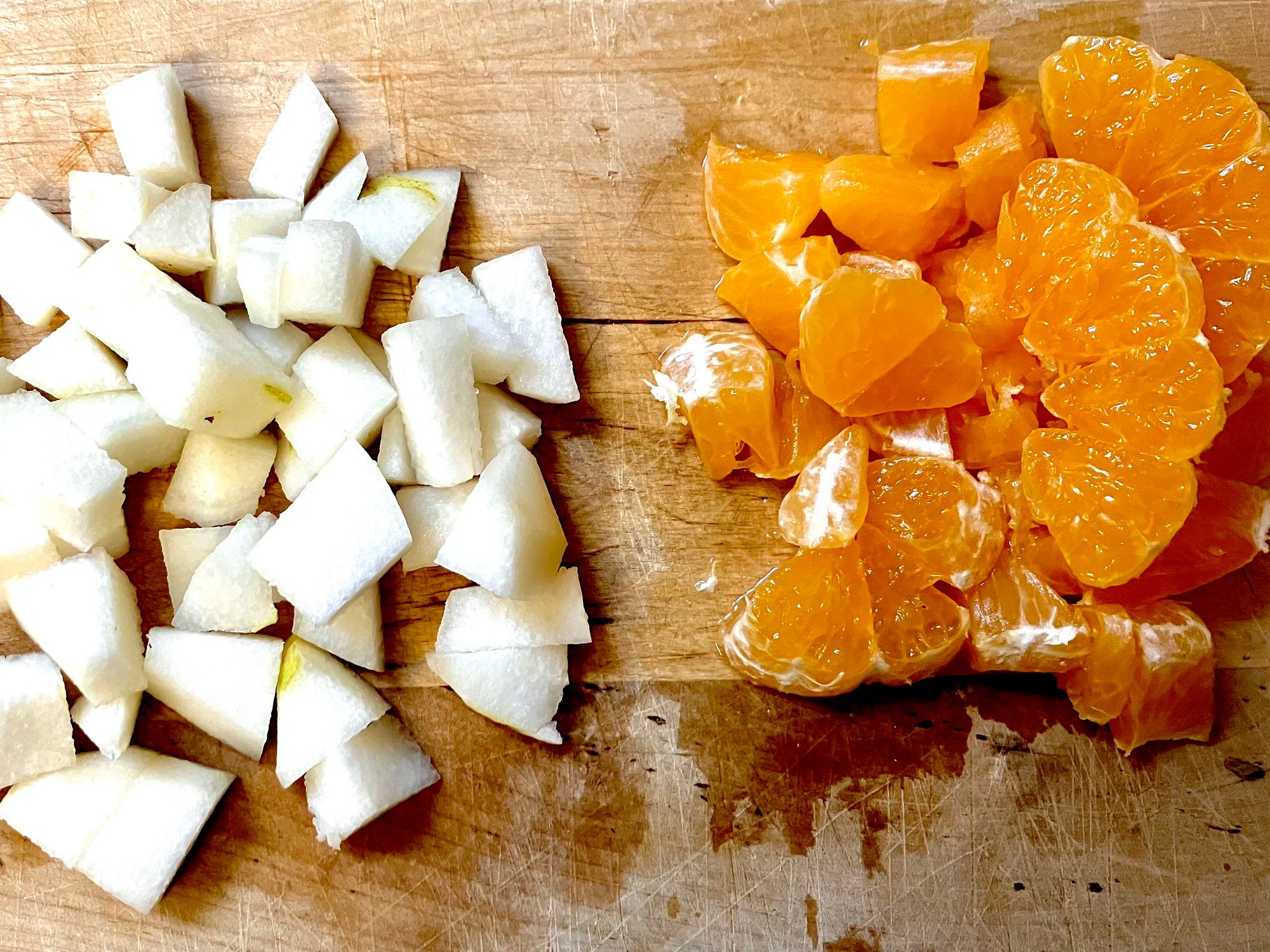 2. Next, peel and chop the pear into small chunks, and peel the tangerine before slicing it horizontally to create rings that easily fall apart. Cut the tomatoes into quarters and crumble the feta.