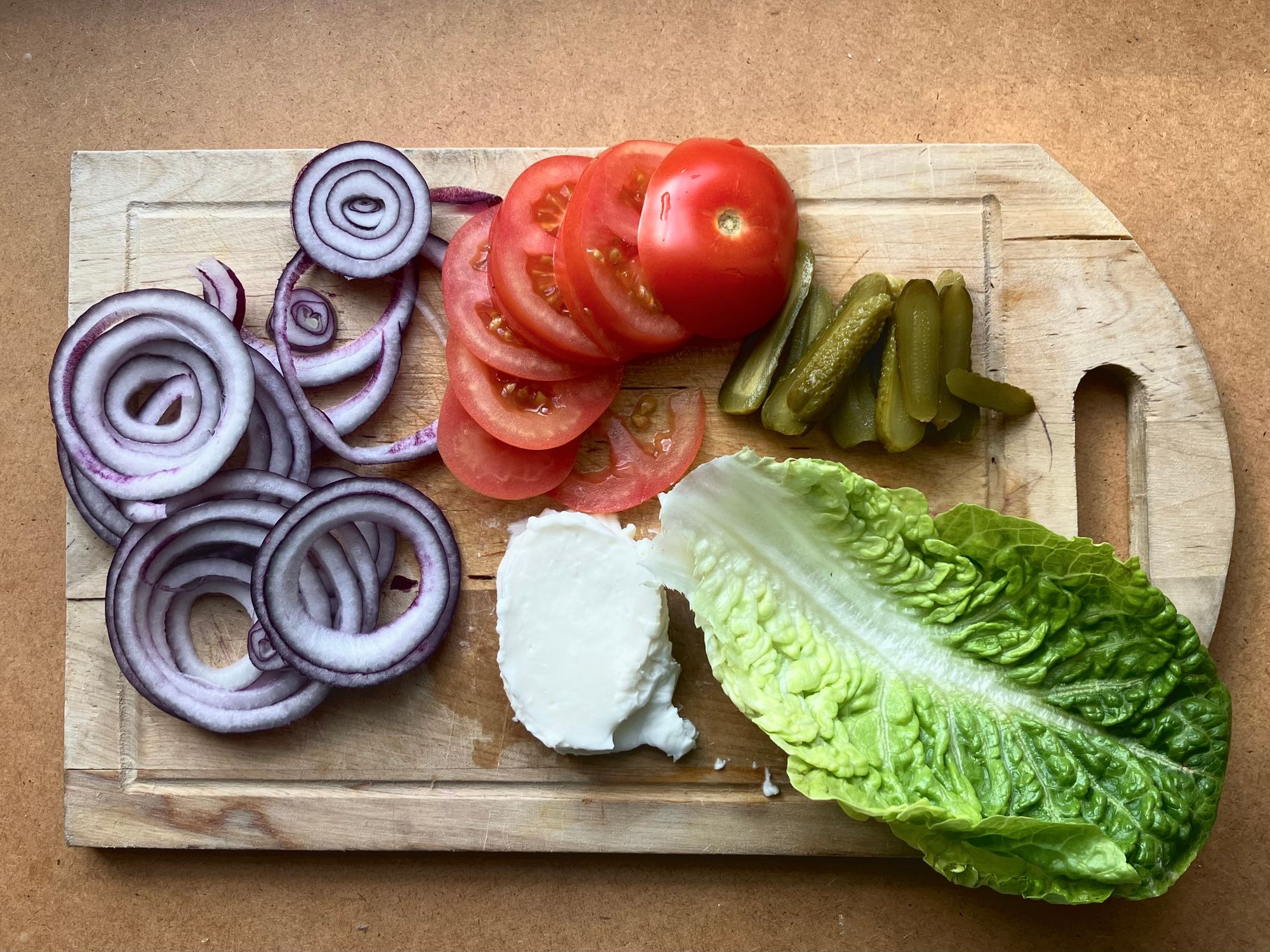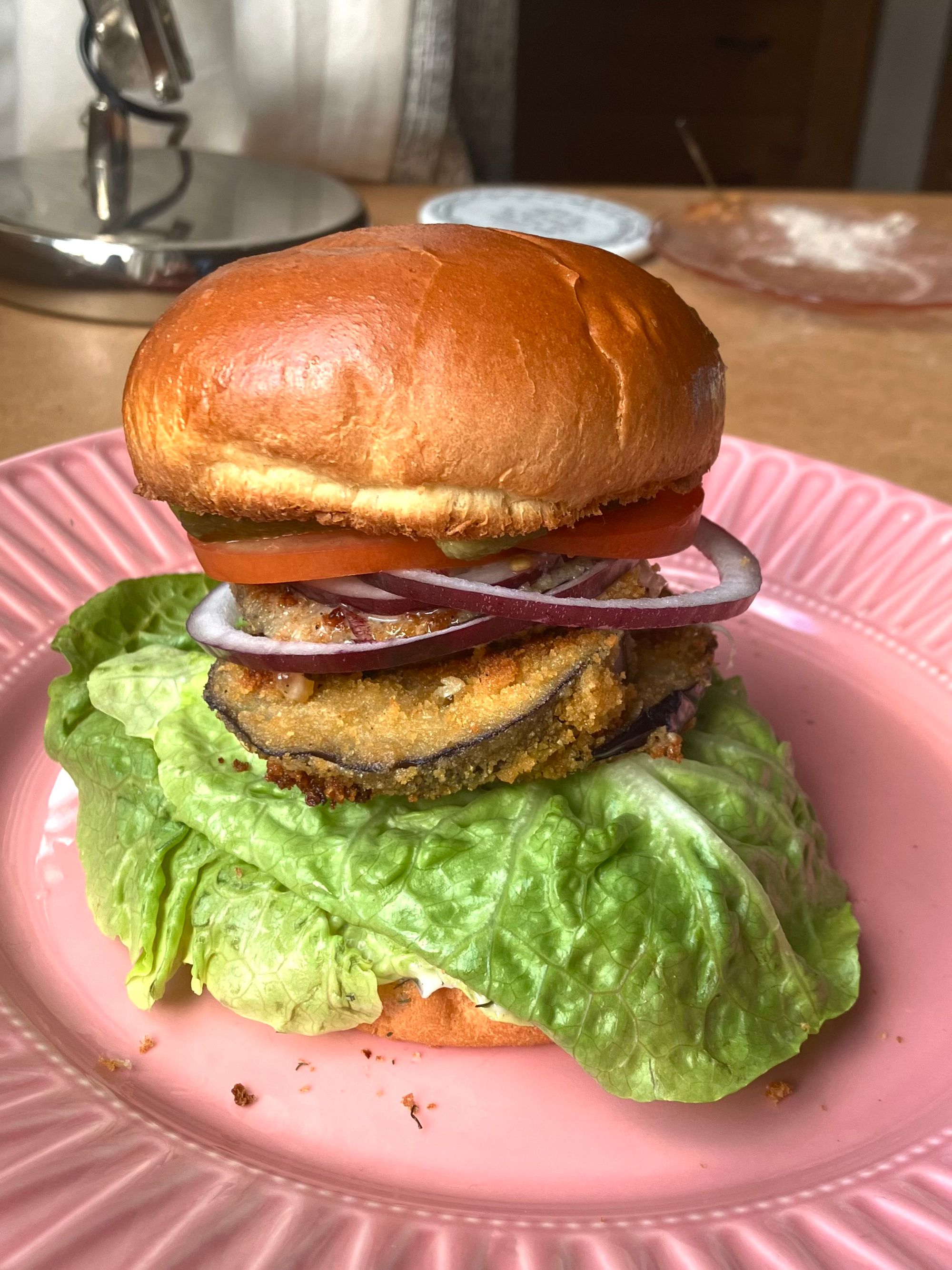 - Once everything is cooked, it’s assembly time! It’s up to you how you do this, but I like to start with a layer of mayonnaise followed by lettuce, then stacking the aubergine on top. Top it off with the rest of your veg and close it up with the top of the bun. You might have some fried aubergine leftover- I eat them like chips with ketchup or mayonnaise. They’re seriously more-ish and make for a great side.