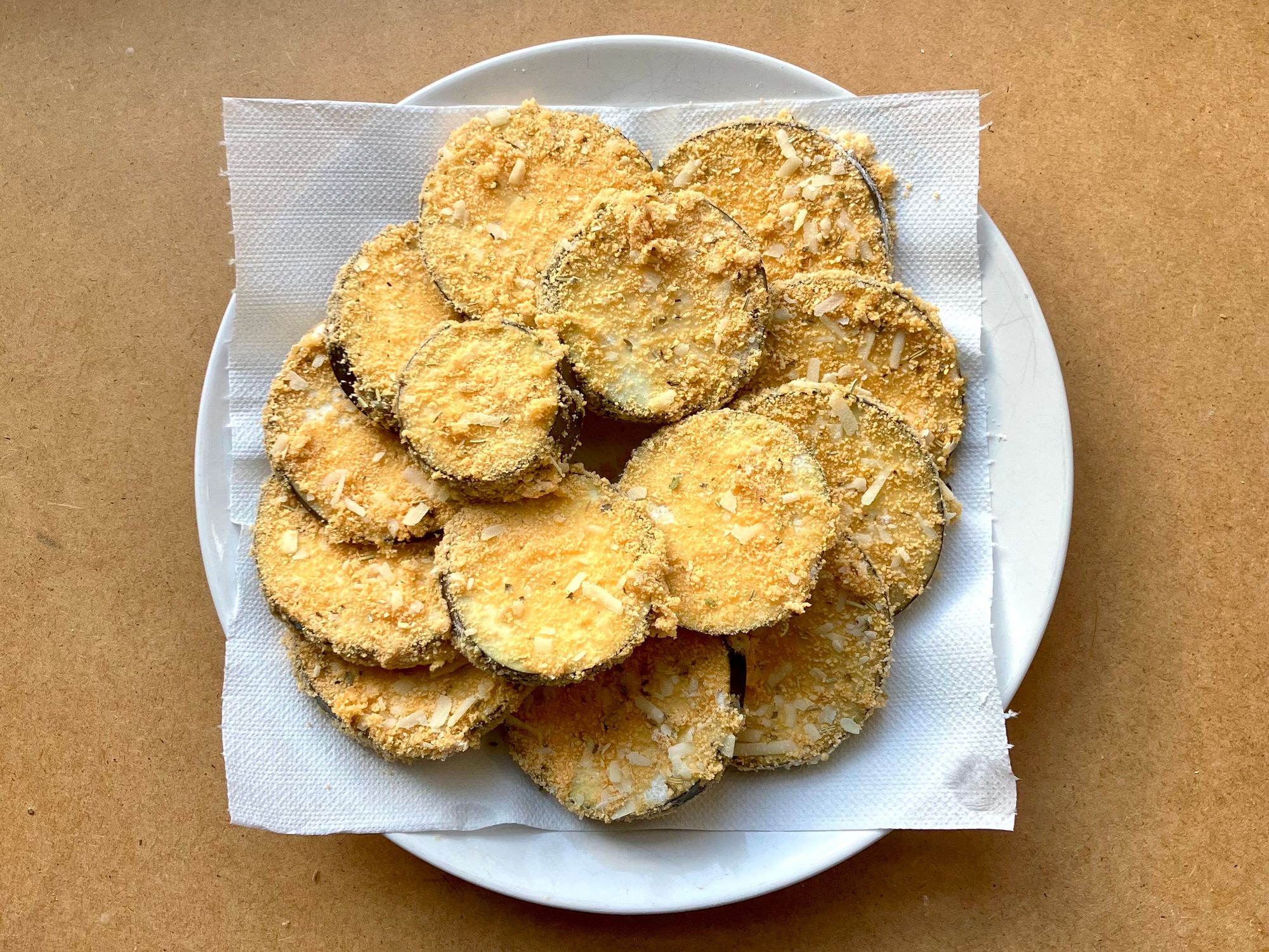 - Slice the aubergine into circles roughly 1cm thick. Dip each one in the flour, then into egg, then into the breadcrumb mixture, ensuring that the aubergine is fully coated each time. Place on a plate and repeat until they’re all ready.
