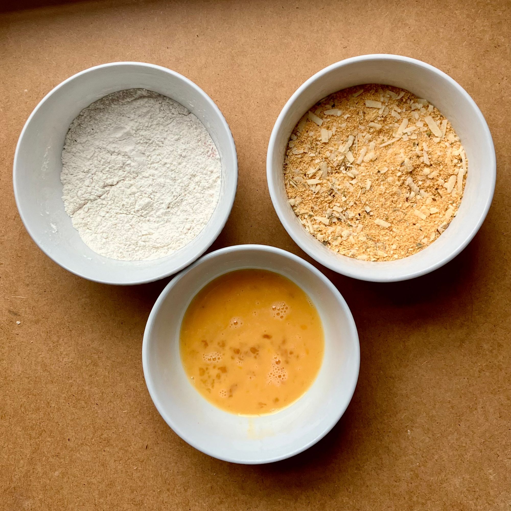 - First, get started on the aubergine. In three separate bowls prepare the flour, egg, and breadcrumb mixture. In the first bowl add the cayenne pepper to the flour and mix until combined, whisk your egg thoroughly in the second bowl, and in the third combine your breadcrumbs, parmesan, dried herbs, and salt.