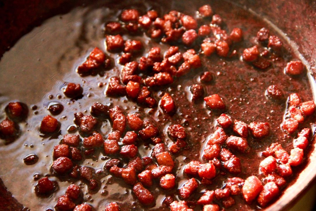 3. Heat up a pan to medium-high heat and add in the guanciale or pancetta and fry it with no oil at all, as the fat will be rendered and that will be more than enough for flavour. I promise you it won't stick! Cook the pancetta for about 4-5 min or until crispy and brown. And then turn off the heat and let the pan cool completely. (VERY IMPORTANT!)