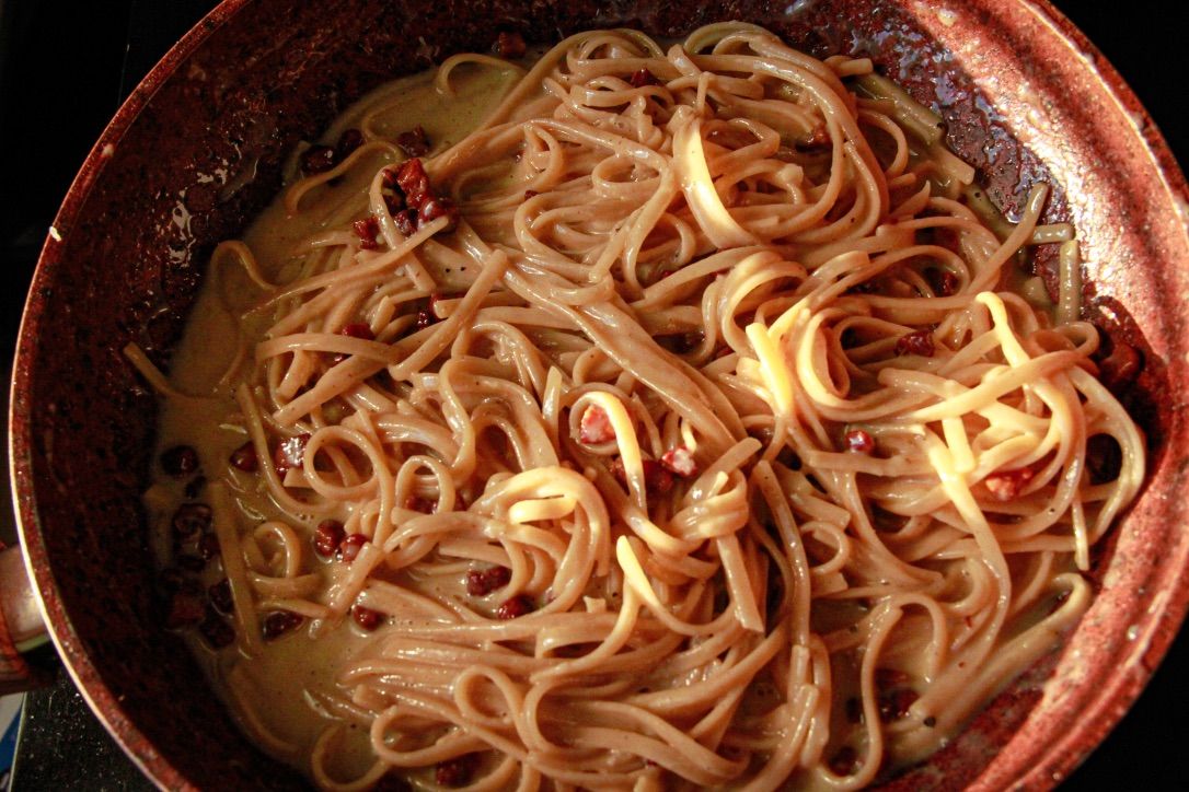 The rule of thumb on deciding how many eggs to use for the dish is usually one whole egg for every four people plus one egg yolk for each person (don't fight me, take it up with my Italian uncle!). So, for example, if you are making a portion for four people, that's one whole egg, and four egg yolks. I have adjusted this recipe for the consumption of two people, where I use one whole egg and two egg yolks. If you want it to taste richer and get a food coma, you can probably "accidentally" add another egg yolk, just don't tell anyone about it.