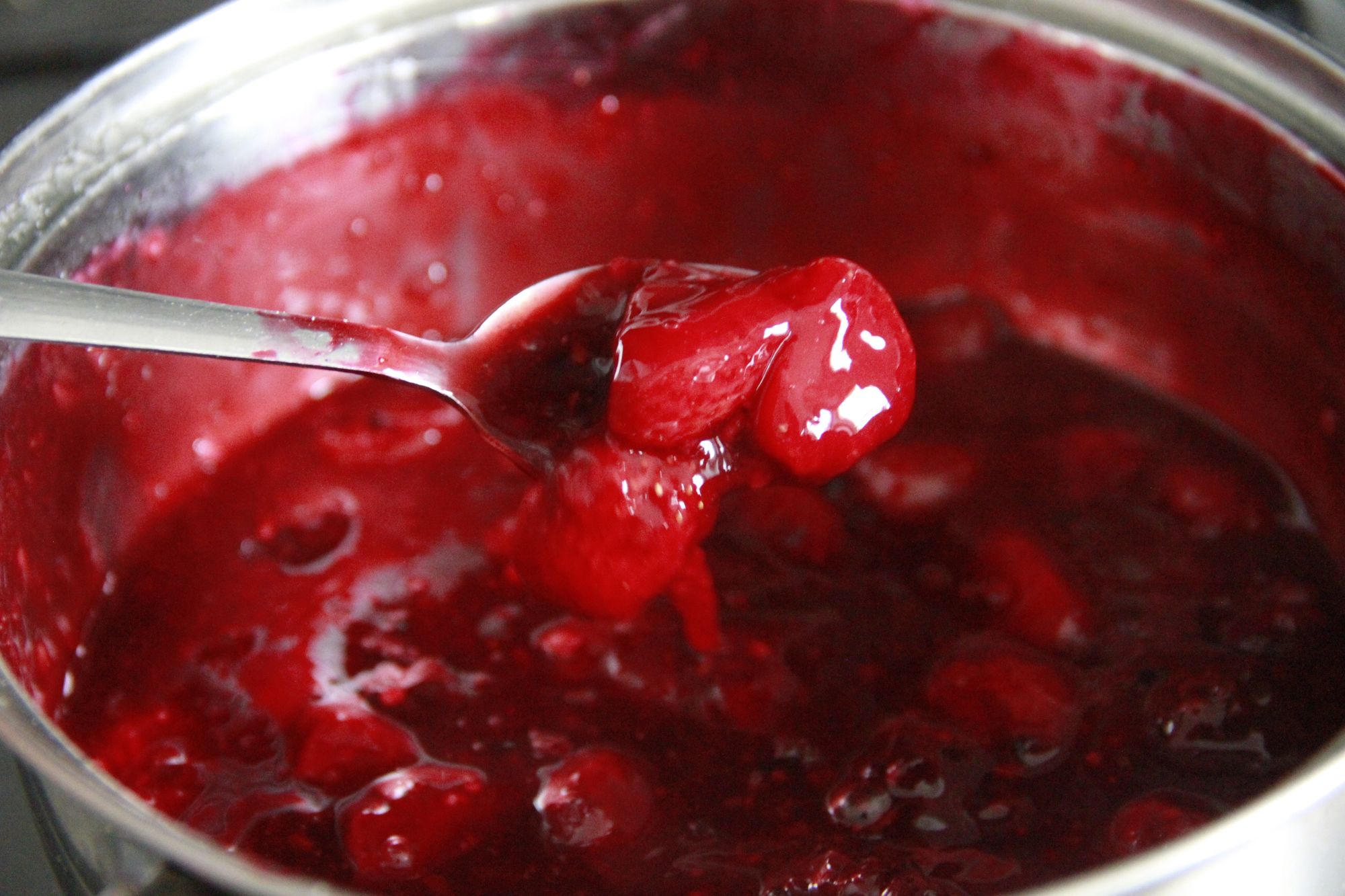 9. For the berry compote, add in 400g of any berries of your choice (can be frozen) in a saucepan/pot on medium-high heat with 40-50g white sugar and add in a shot of vodka or lemon juice. Stir often with a rubber spatula, the compote should have a liquid-ish sauce, if you want to thicken it slightly, gently sift in about a tablespoon of cornflour a little bit at a time and stir well until desired thickness is met. It’s very much possible that you may not even need a whole tbsp of cornflour (hence the adding of it a little bit at a time). Let it cool before serving with cheesecake.