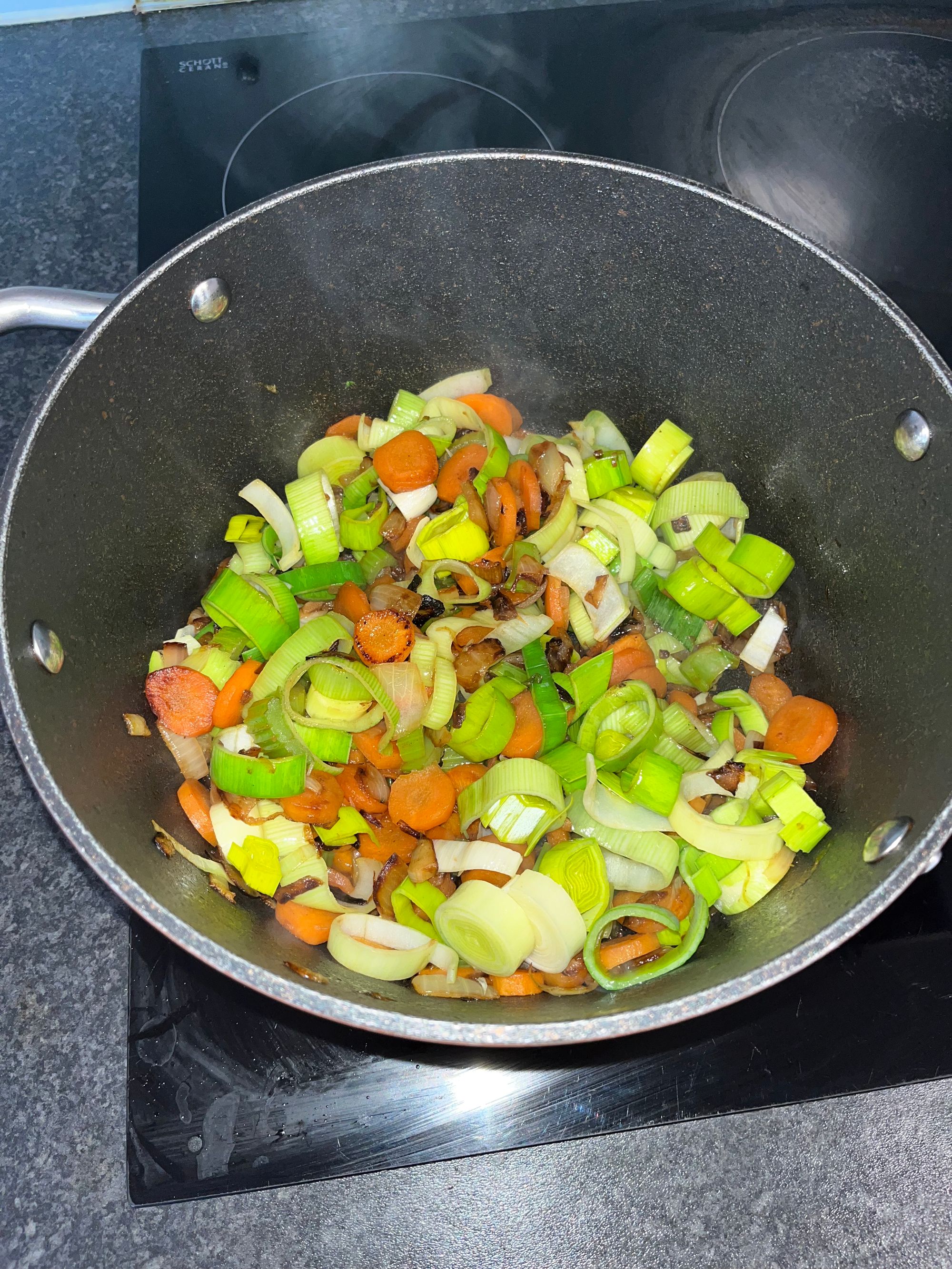 1) Preheat your pot to a medium-high setting and add a splash of sunflower oil to sauté the vegetables in. I like to start with this step as I cut and dice the veggies, adding them to the pan as I go along. This makes it quite an organic process, influencing the rest of the preparation and the order of the ingredients.