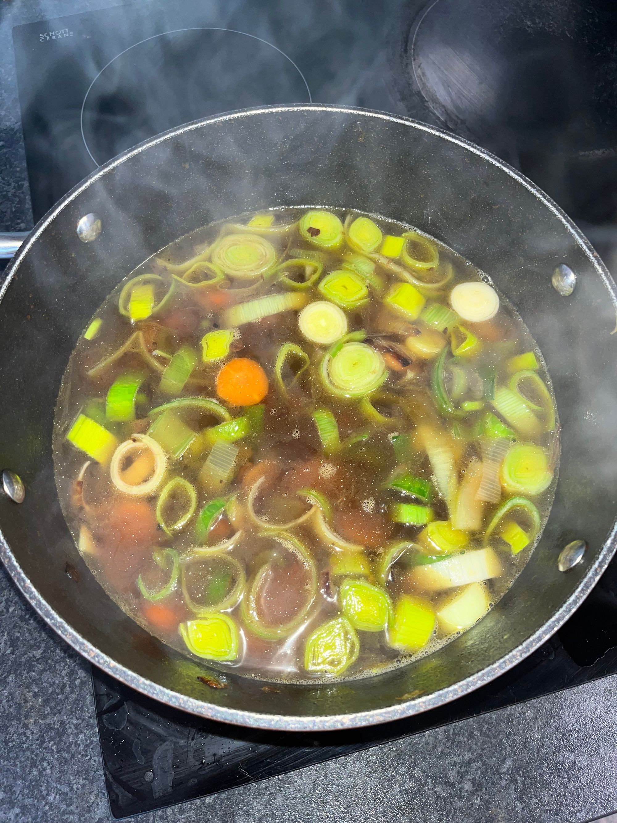 7) Trim the outer layer of the leek, cut the root end, and chop up the leek into medium-sized discs. If you haven’t prepared leek before, aim to preserve the tender green and the lower white parts as they’re the most flavourful.