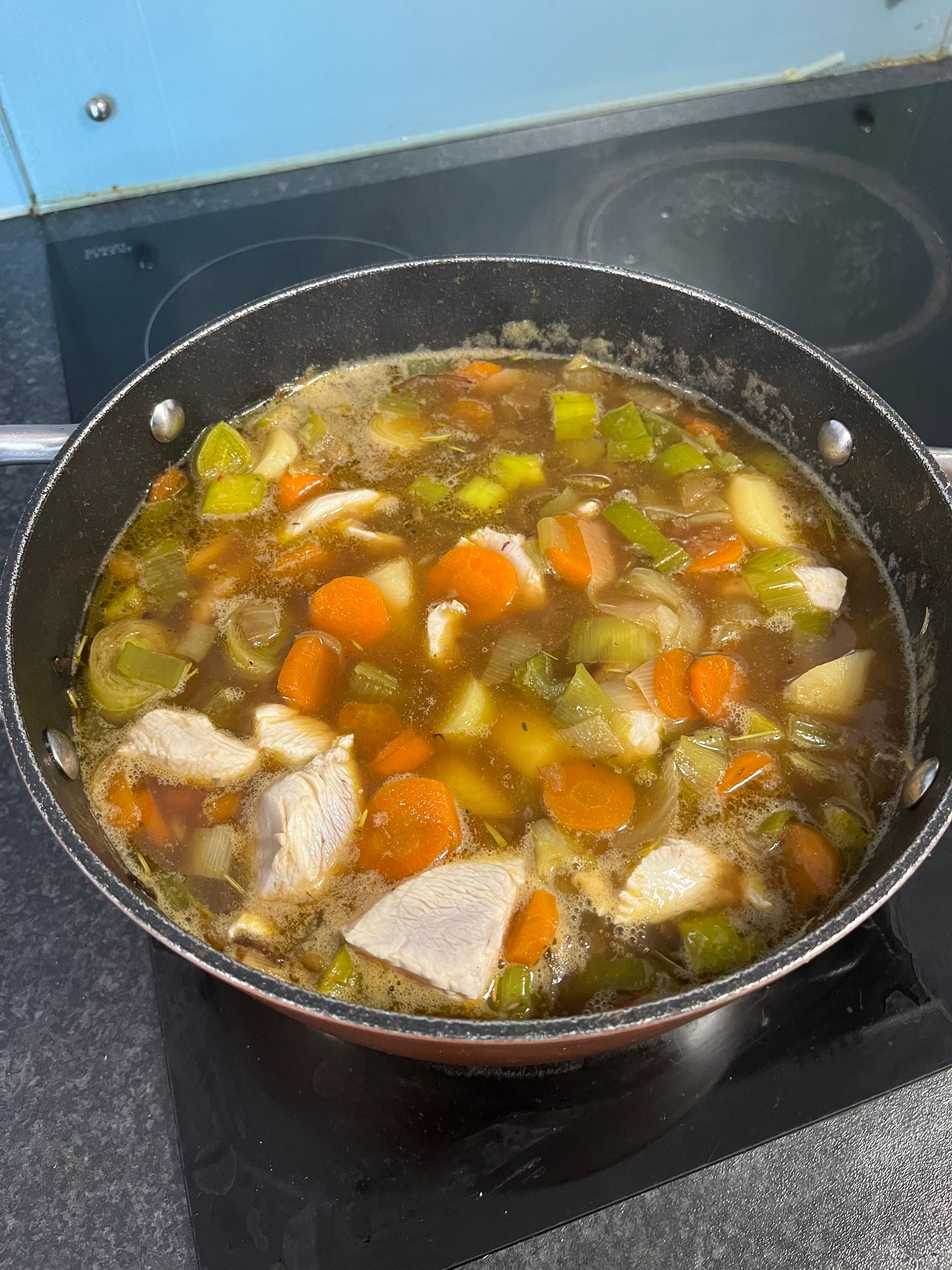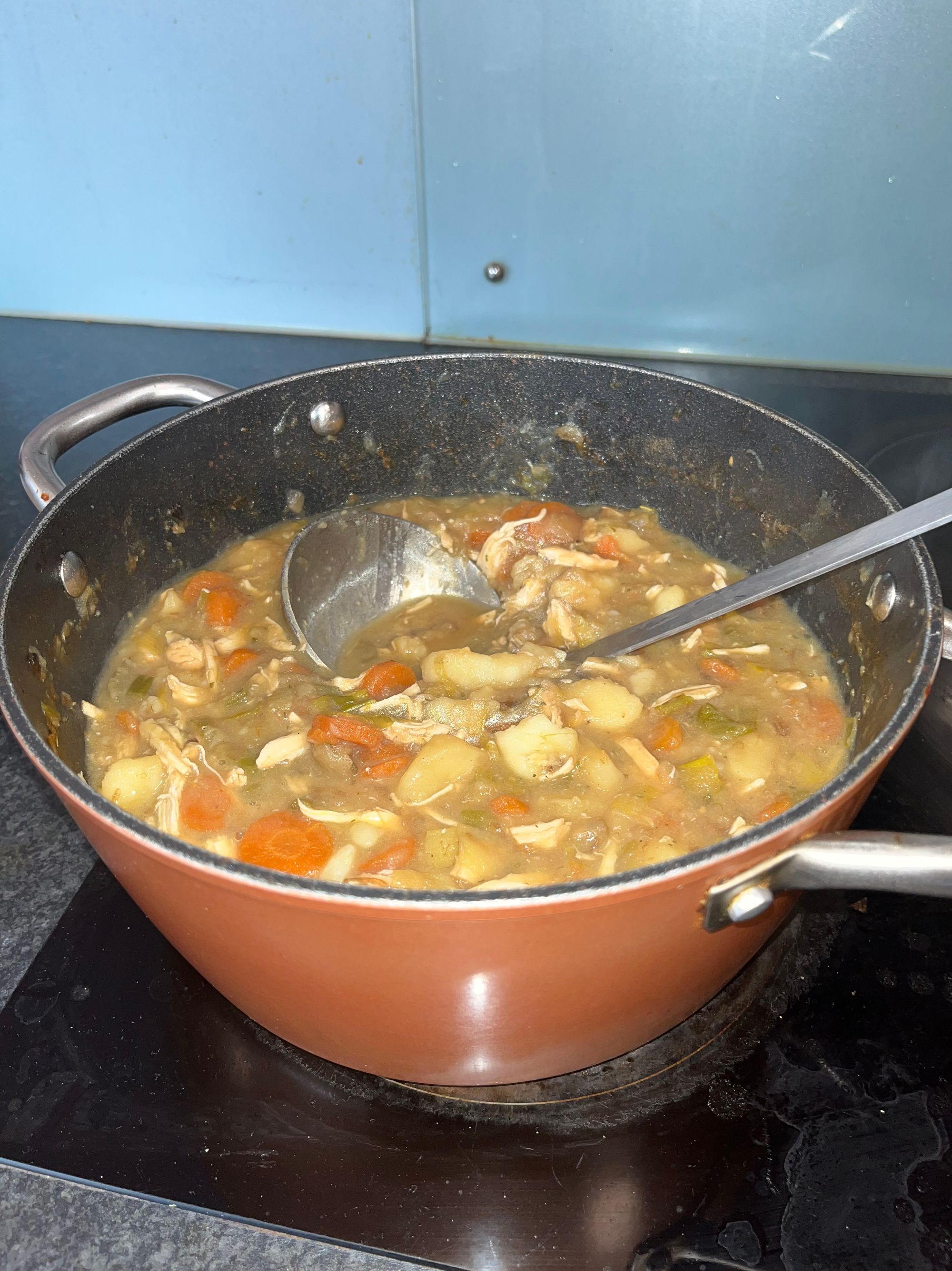 Prep Time: 20-30 minutes to peel, cut, and start cooking your veggies before adding the broth. 45 mins to boil the potatoes and chicken.