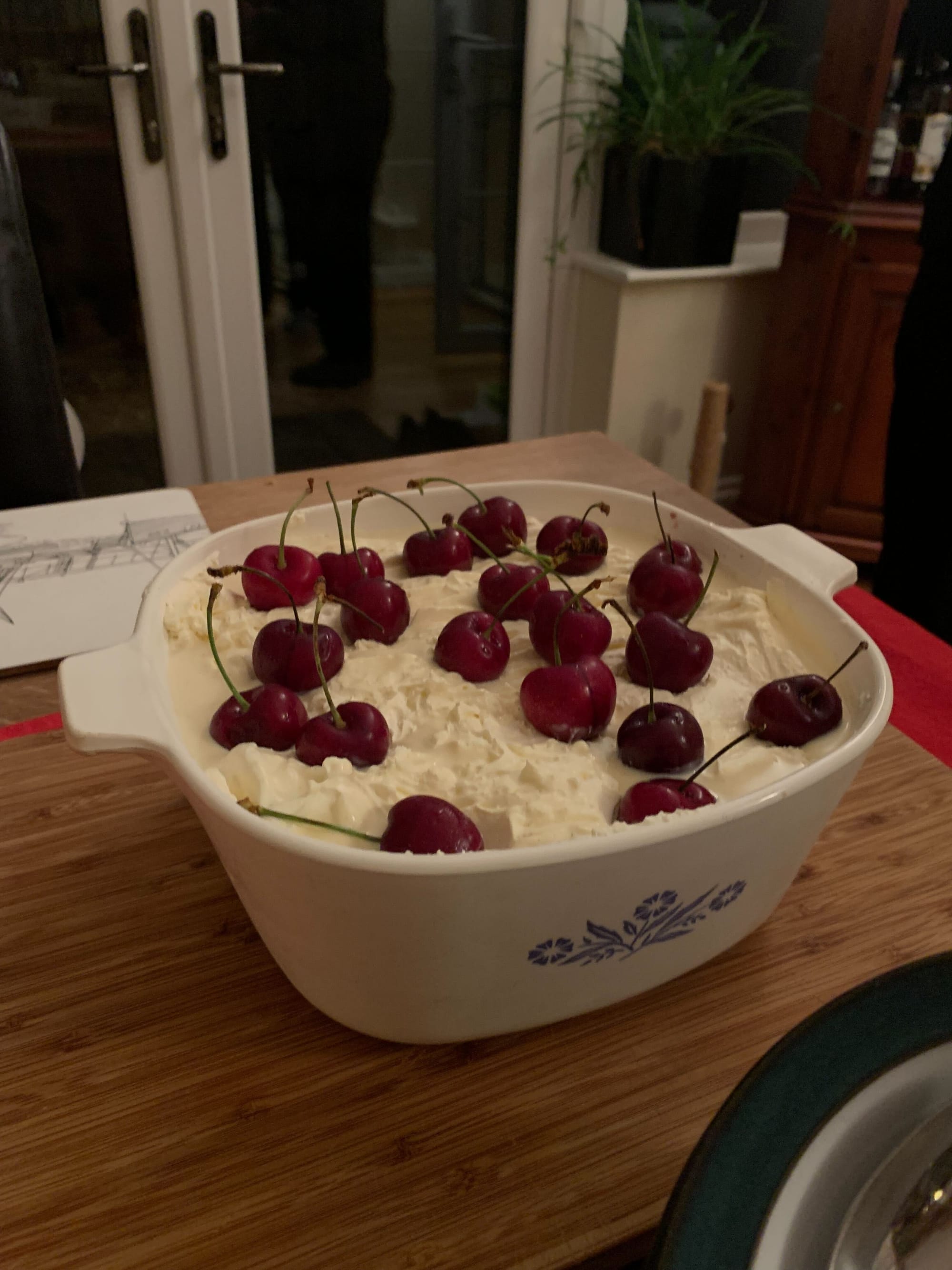 - Pour the custard into the trifle dish to form the next layer before spooning out the whipped cream to top the custard. Garnish with fresh cherries.