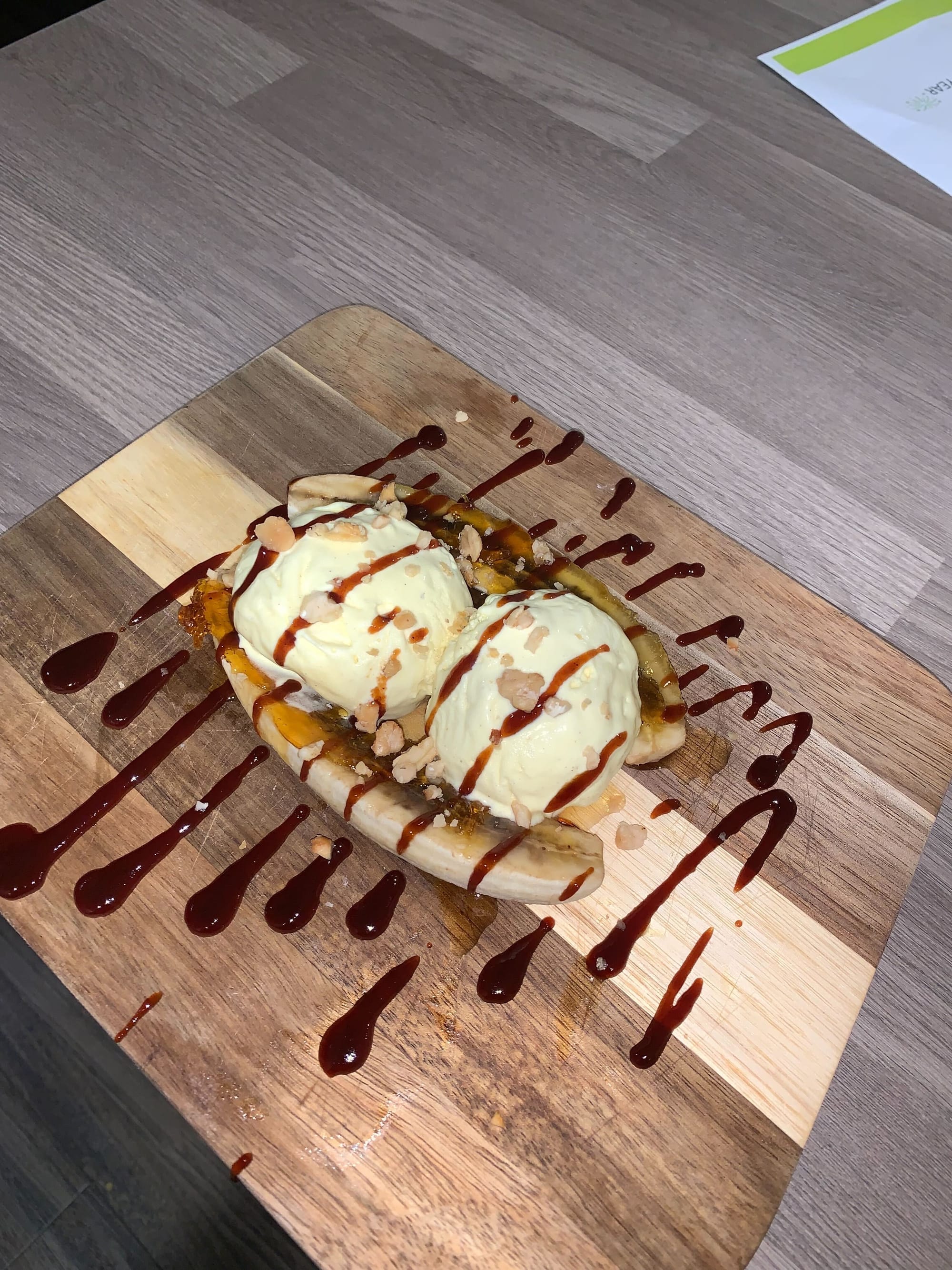 - Once ready for serving, place the caramelised bananas on a serving plate, scoop the ice cream and place in between. Drizzle the chocolate sauce over the caramelised bananas and ice cream, then garnish with crushed peanuts, alternatively, any choice of fruit or whipped cream can be added.