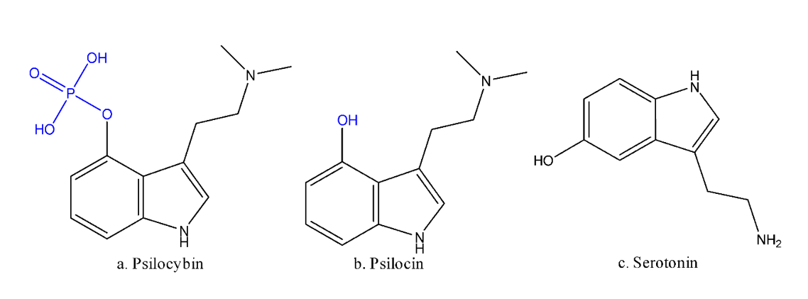 When ingested, psilocybin loses its phosphorus group to become psilocin (Figure 1.b) a very structurally similar compound to serotonin (Figure 1.c), the happiness neurotransmitter.