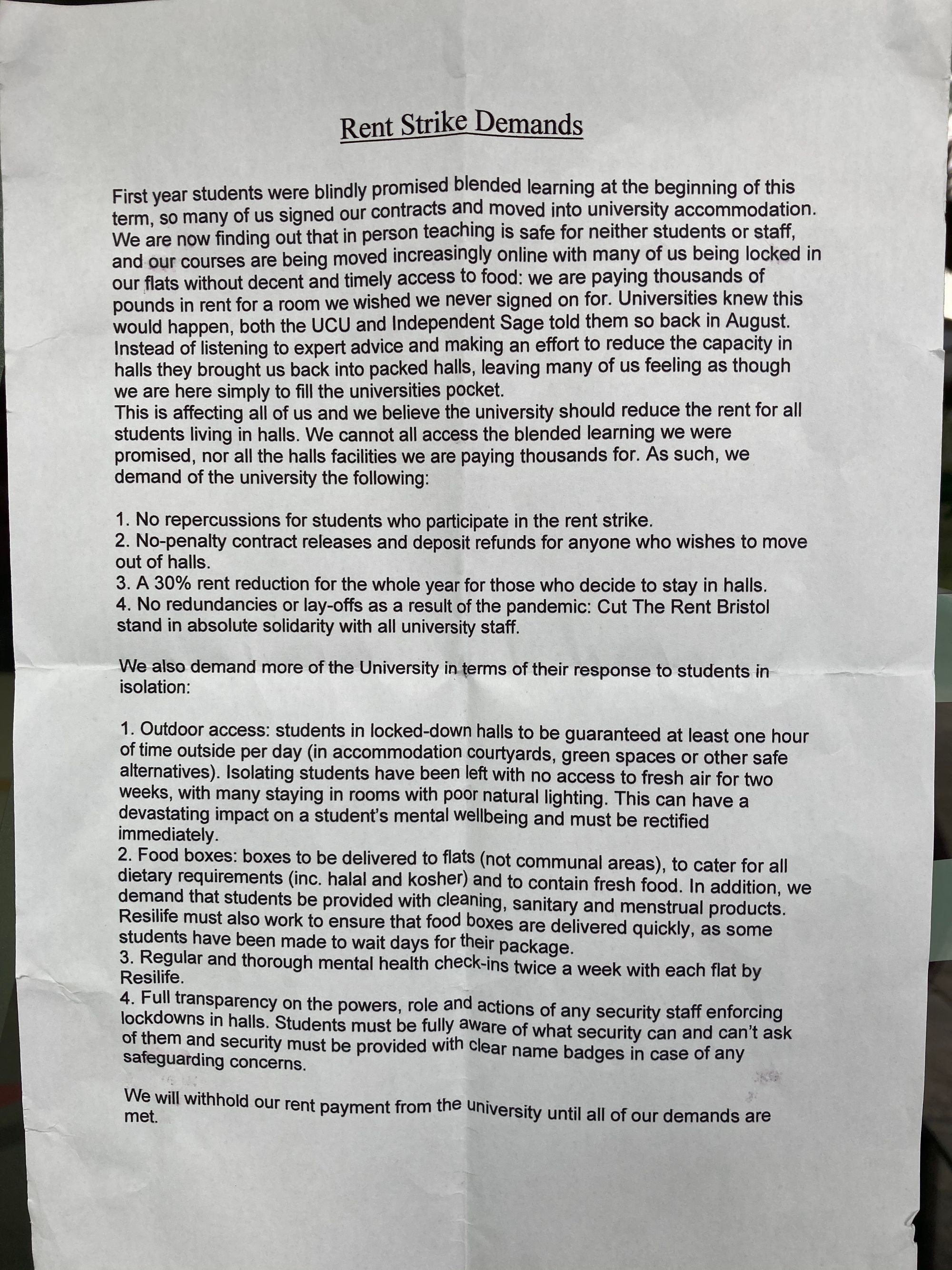 One of the group’s central demands is for a 30 per cent rent reduction for those who decide to stay in their halls for the whole year group.