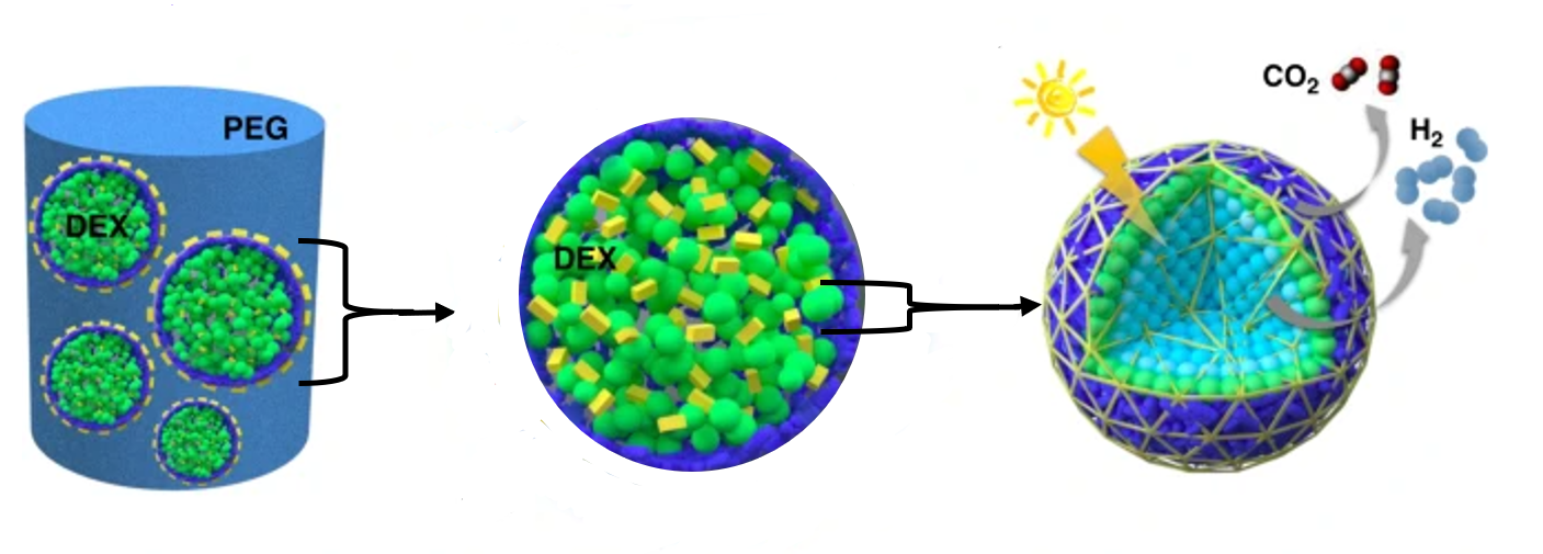 To build these micro-reactors, the algal species Chlorella pyrenoidosa and the bacterial species Escherichia coli were cultured in the lab. They were then mixed with a solution of two chemicals, dextran and PEG, to form droplets which trap the algae and bacteria inside them spontaneously.