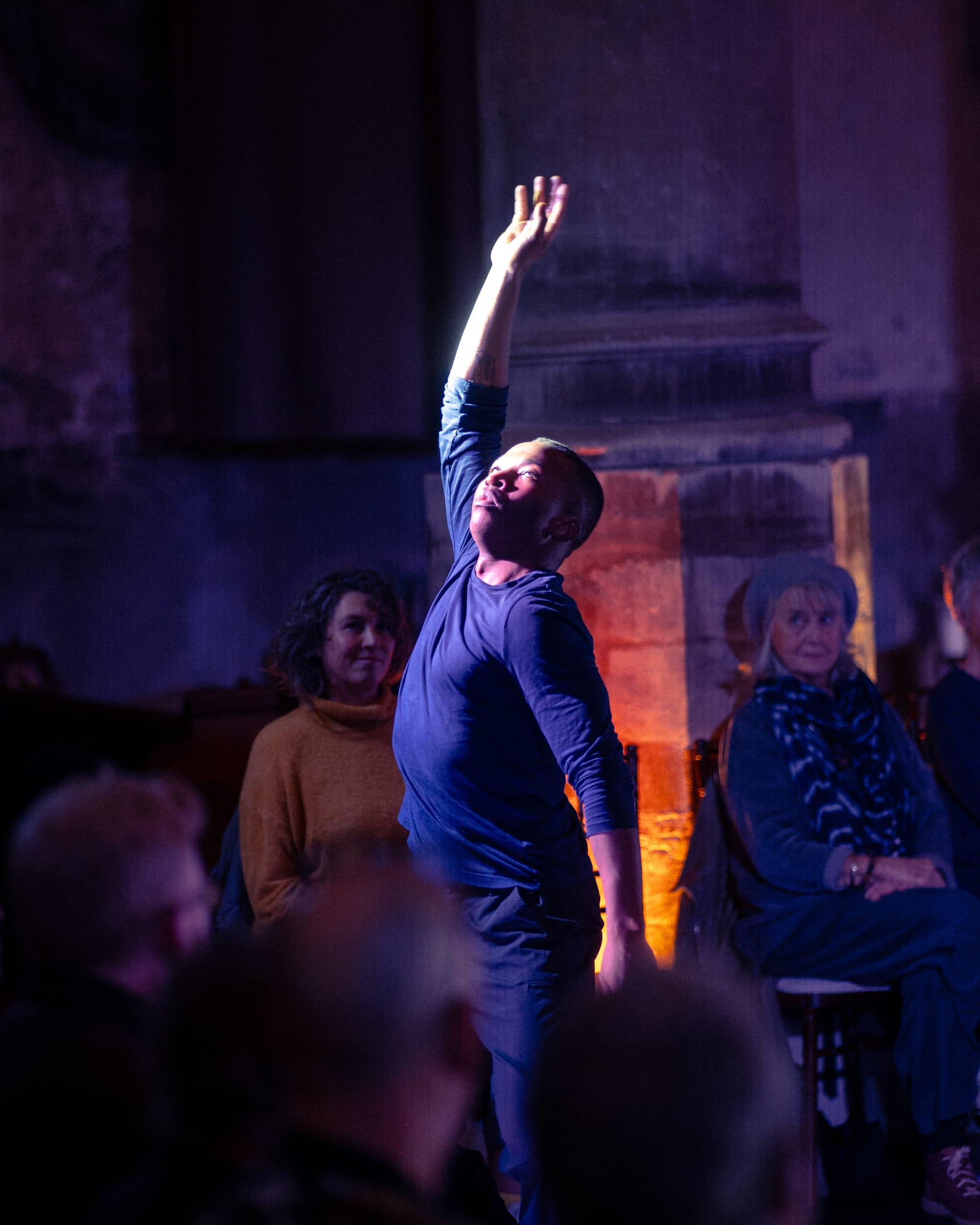 Even before the show began, the events space at The Mount Without - a vast church hall restored by locals after decades of neglect and vandalism - underpinned the performance with a sense of deep profundity. The audience was seated within an intimate ‘theatre-in-the-square’ arrangement, eyes of every age gazing inward upon rows of illuminated faces. A gentle buzz filled the air, our hushed anticipation. Muntanga sat motionless in a corner of the room, head bowed as if in pensive prayer. For a moment, the air stilled, and the room appeared to hold its breath. Then, a stirring ambience began to filter through the sound system - rustling movement, a baby crying, the low and familiar rumble of civilian life. Muntanga rose, turned to face the centre of our square, and the show began.