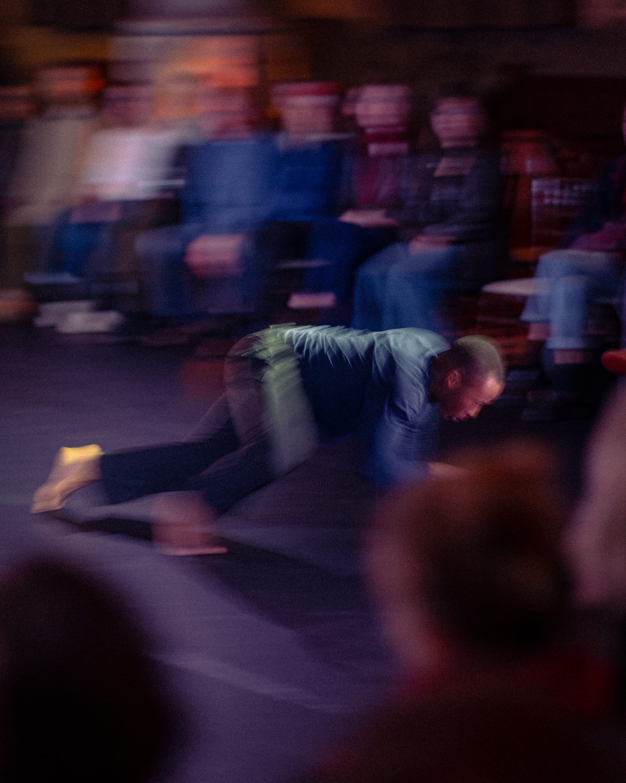 Muntanga engaged every aspect of physical expression in his work, combining stunning choreography with breathwork, spoken word, and facial contortion, a technique that was at once unexpectedly experimental and wildly immersive. His artistry was expressed with such intent and sincerity that it felt as though the air he clasped held tangible shape, and when he silently opened his jaws I could almost hear his scream. A moment that stood out to me as encapsulating the eerie beauty of Muntanga’s piece came as he came to a sudden halt and held an outstretched thumb to an audience member, with his eyes wide and staring, and his tongue sticking out. Something unspoken seemed to pass between Muntanga and the man before him, who held his gaze with only a gentle smile. The man, as if understanding, brought his own thumb to rest just beside the dancer’s. A moment of wordless communication, that intrinsic human connection. Just as swiftly as he had stopped, Muntanga was then pulled back into the unceasing force of his own dance, and we moved into the second stage of Akropolis I.