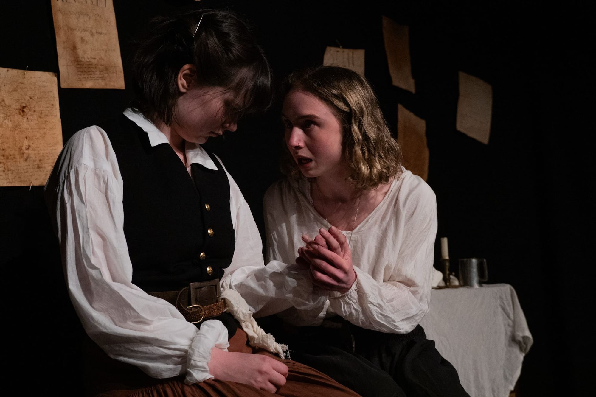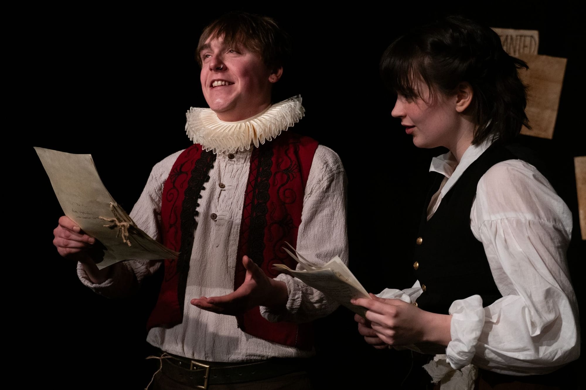 What little set there is is immediately communicative of the play’s setting and themes without ever shoving it in the audience’s face. The yellowed and curling ‘wanted’ and ‘warning’ posted pinned to the back curtain give the play a quiet but sharp aura of paranoia and suspicion. They never let the audience forget that, behind all of the frilly ruffs and witty lines lies a sinister and simmering underbelly of fear and bigotry that, over the course of the play, curdles to a boiling point.