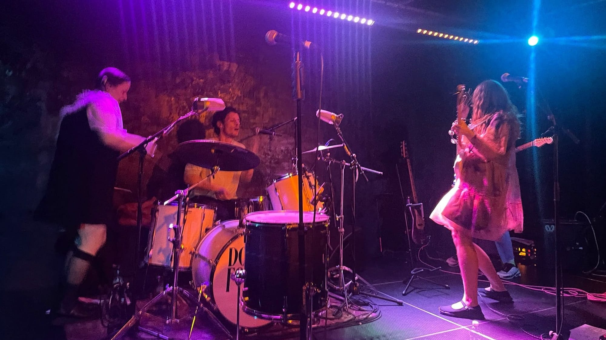 Having never visited Dareshack for a gig, knowing it only by day as an unassuming café, I’m unsure of what to expect slipping into the yellow doors marked ‘studio’. But after spotting a hot pink glittery bass guitar propped up to the side of the stage, I knew I was in safe hands.