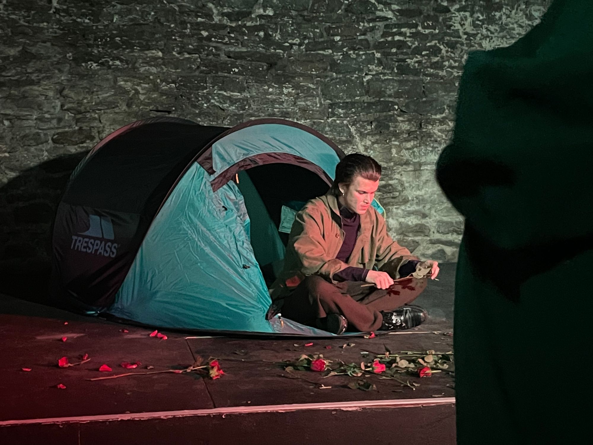 Upon arrival, we were encouraged to walk around the three cave-like tunnels of the venue, and get as close to the actors as we liked. It was refreshing to see some audience members on stage with the actors and even inside a tent with one character as they jammed out to imaginary music.