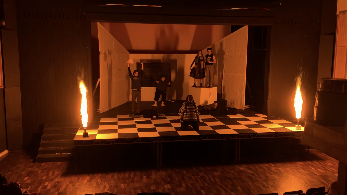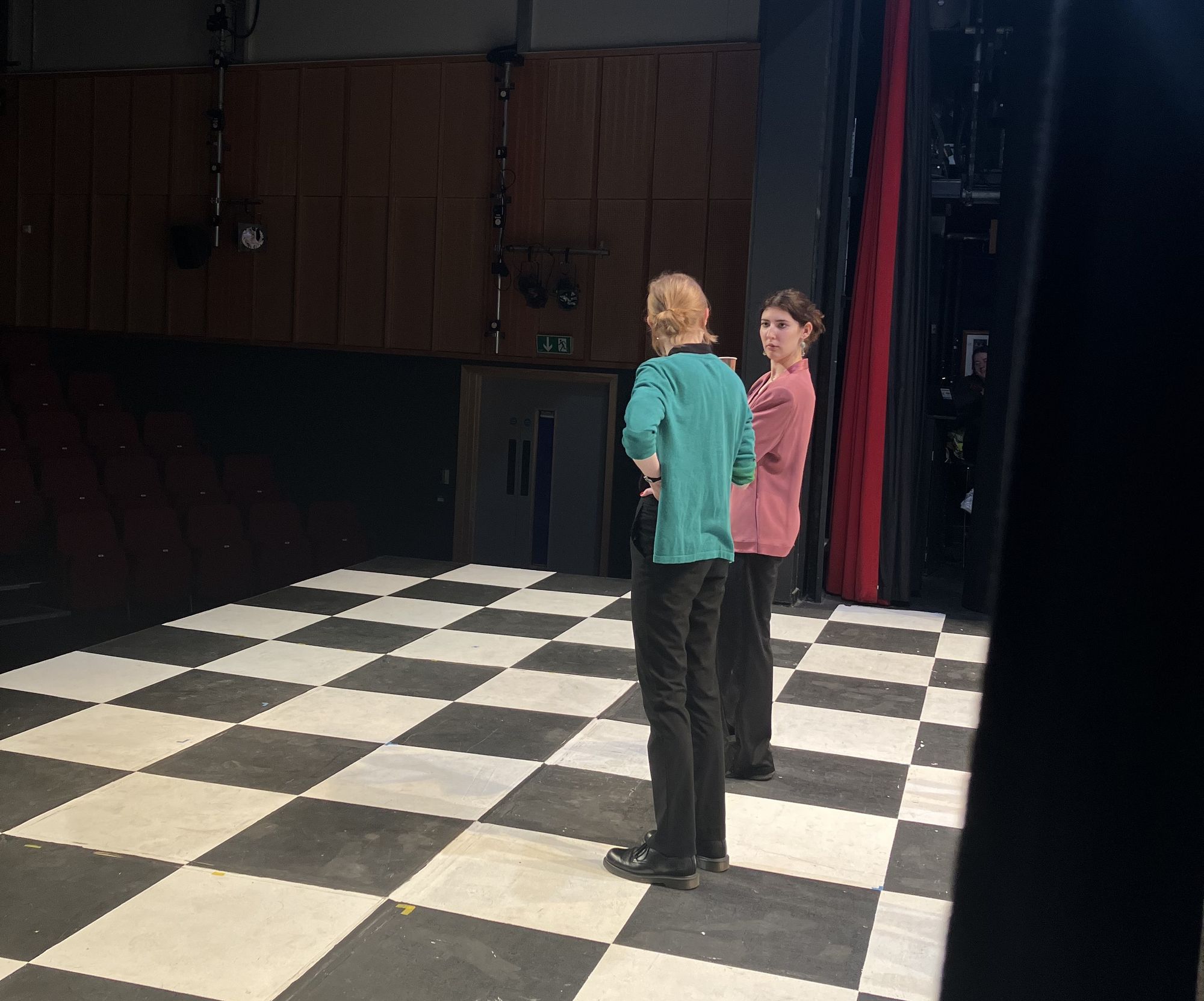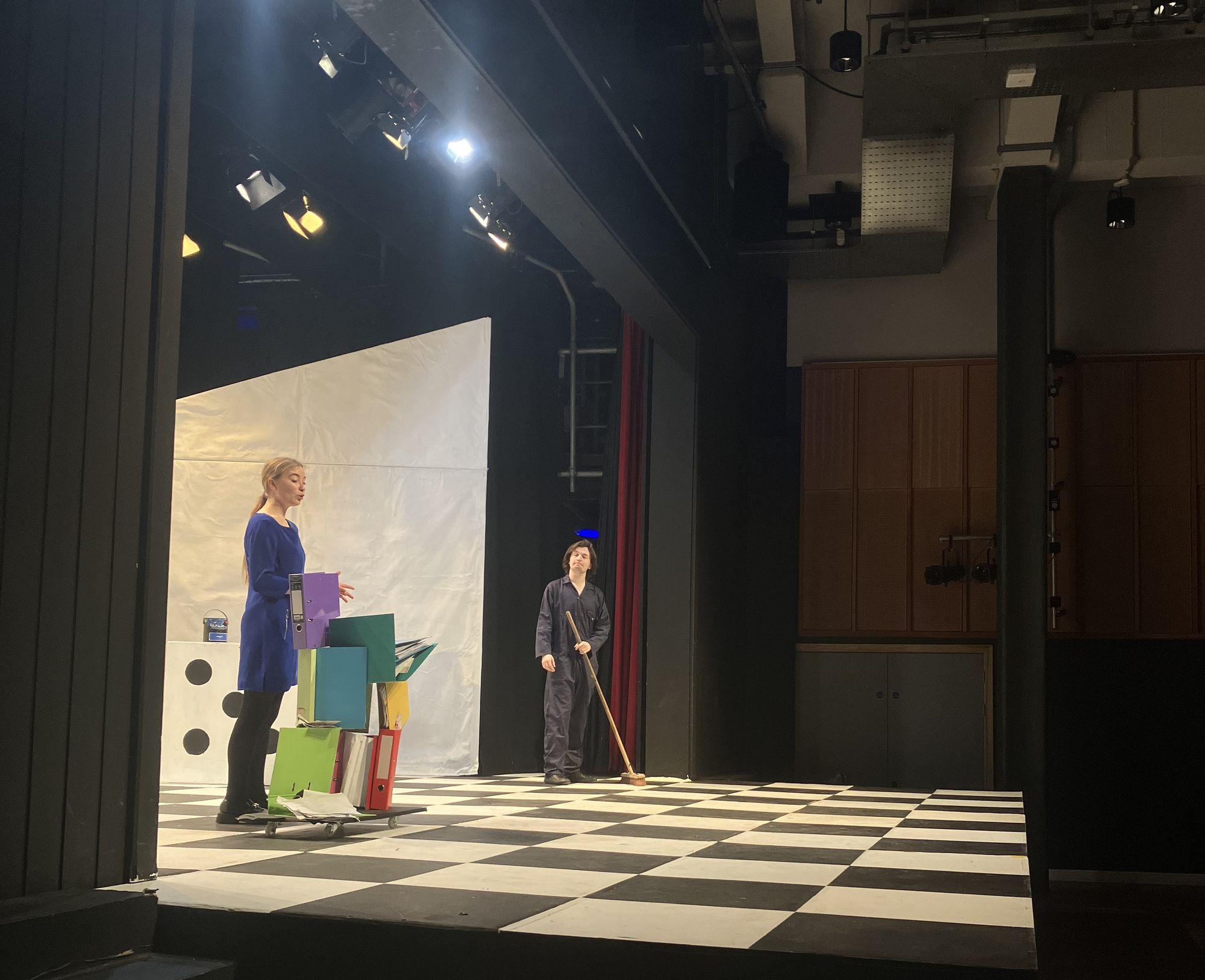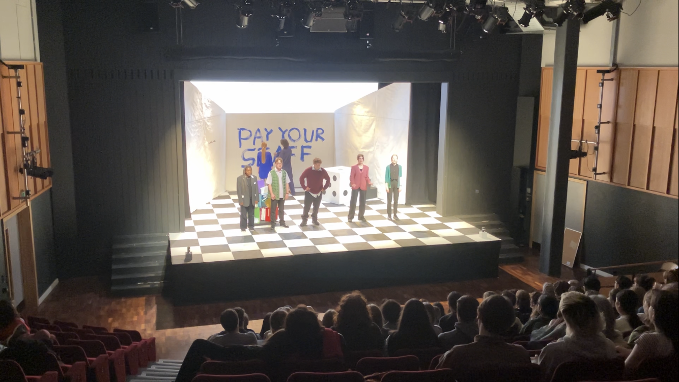 The set was minimal, drawing attention to a few Alice-In-Wonderland-esque objects including blown-up dice, a deck of cards and a chessboard, showing a running game-playing theme. At one point the words ‘PAY YOUR STAFF’ appeared in paint on the back wall - appropriate given that the production was scheduled during the third week of UCU strikes.