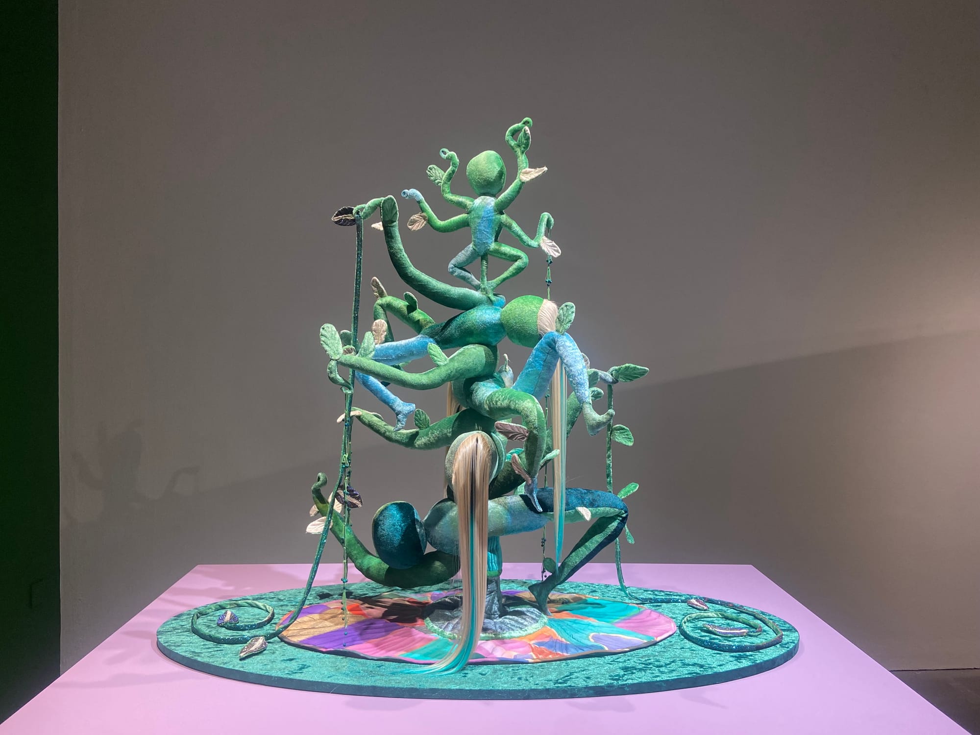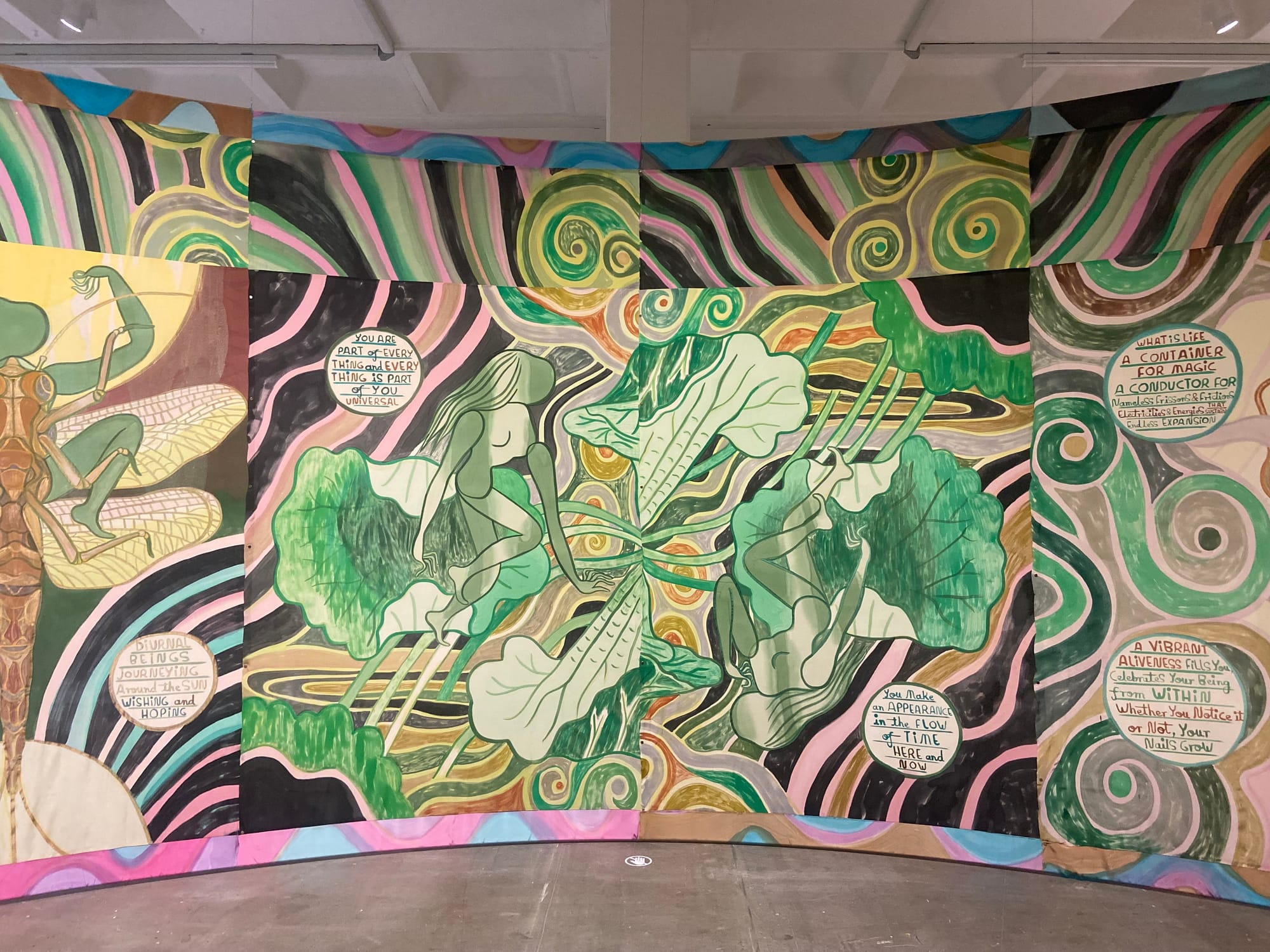 Upon entering the exhibition, the sheer ambition of Emma Talbot’s work was clear to see. One of the primary pieces on the downstairs floor, a vast silk tapestry titled ‘Are You a Living Thing That Is Dying or a Dying Thing That is Living?’ envelops the viewer as they observe the intricate paintings of nature and the movement of bodies through the imagined cosmos-like landscapes; with Talbot’s choice of style creating an organic and earthly feel simultaneously. The use of text within Talbot’s work serves to immerse the viewer further, facilitating messages such as ‘whether you like it not, your nails grow’ and ‘give birth to yourself over time’ and thus foregrounding the cyclical elements of her art too. Indeed, growth in relation to the cycle of life and death is a prevalent element of ‘Everything Is Energy’, as seen in the beautiful textiles piece: ‘Generative Plant 2025’, which also introduces an element of spirituality into Talbot’s work through imagery reminiscent of a Hindu deity.