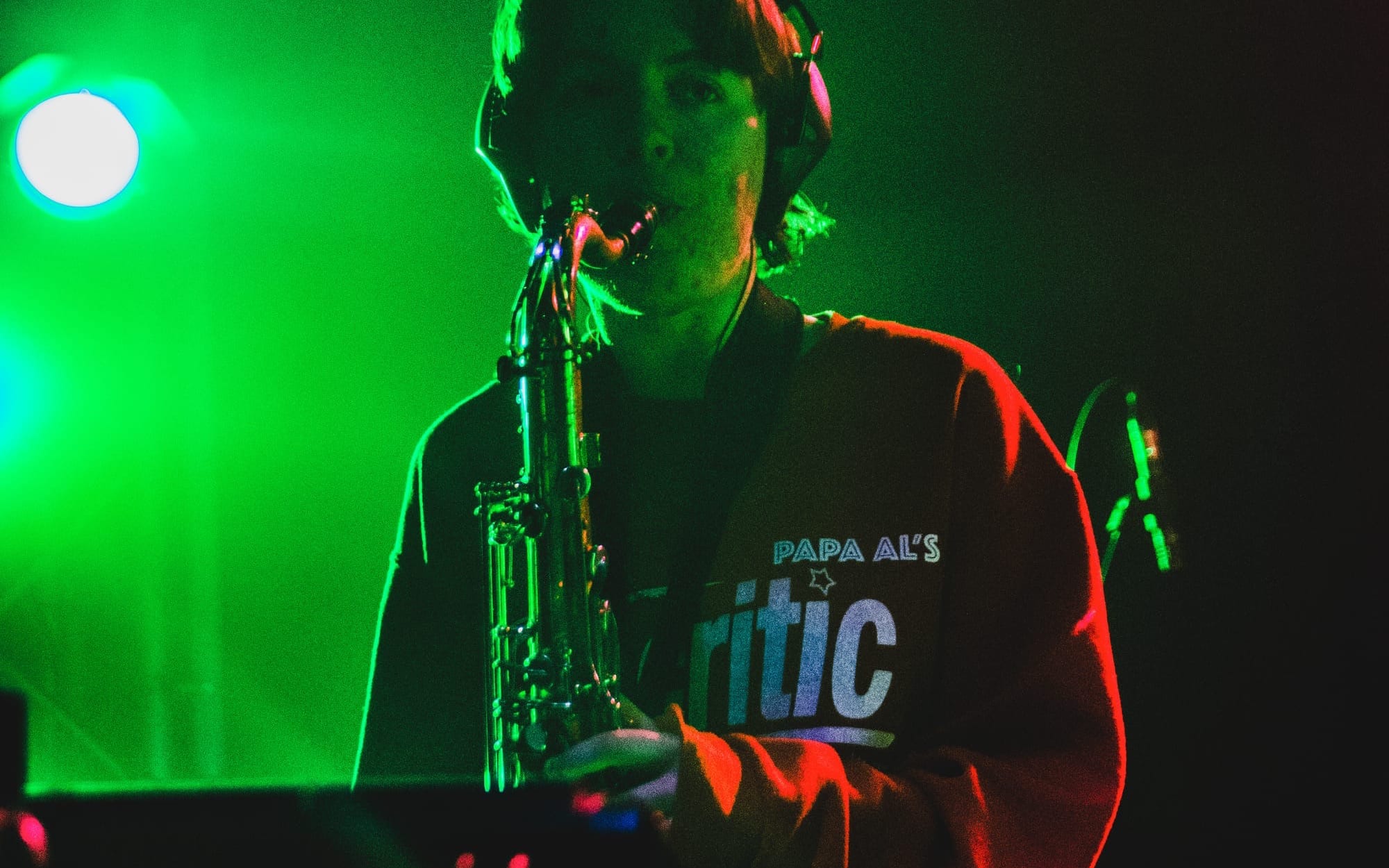 Pictured above is saxophonist Morgan Wallace, a steady presence throughout the gig and co-creator of the various unhinged dances. Taking a break from her own musical ventures - Morgan Noise, an experimental electronic pop jazz creation, Wallace wows the audience with skilfully playing, undisrupted by the cacophony of calamity happening around her.