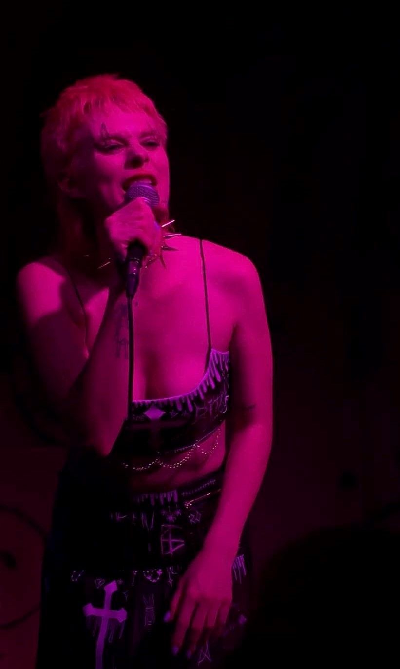 GIRLI starts with a fan-favourite ‘Day Month Second’, a sing-along heartbreak hit that has the crowd chanting along with her. The energy from both GIRLI and the crowd only increases as she begins her next song, ‘Has Been’, an anthem marking the wake of a relationship ending. The aesthetic of the show matches the spirit of these songs – a pink backdrop with the word ‘GIRLI’ sprayed onto it stands behind as she sings, as well as a neon lit ‘GIRLI’ sign on stage. Her outfit is a black and white two-piece with skulls and crosses on it, with black and white tights and a Vivienne Westwood styled flamed eye makeup to match (in pink of course). Fusing classic punk iconography with an overtly pink colour palette, GIRLI’s feminist protest can be understood as much in her music as in her presence.