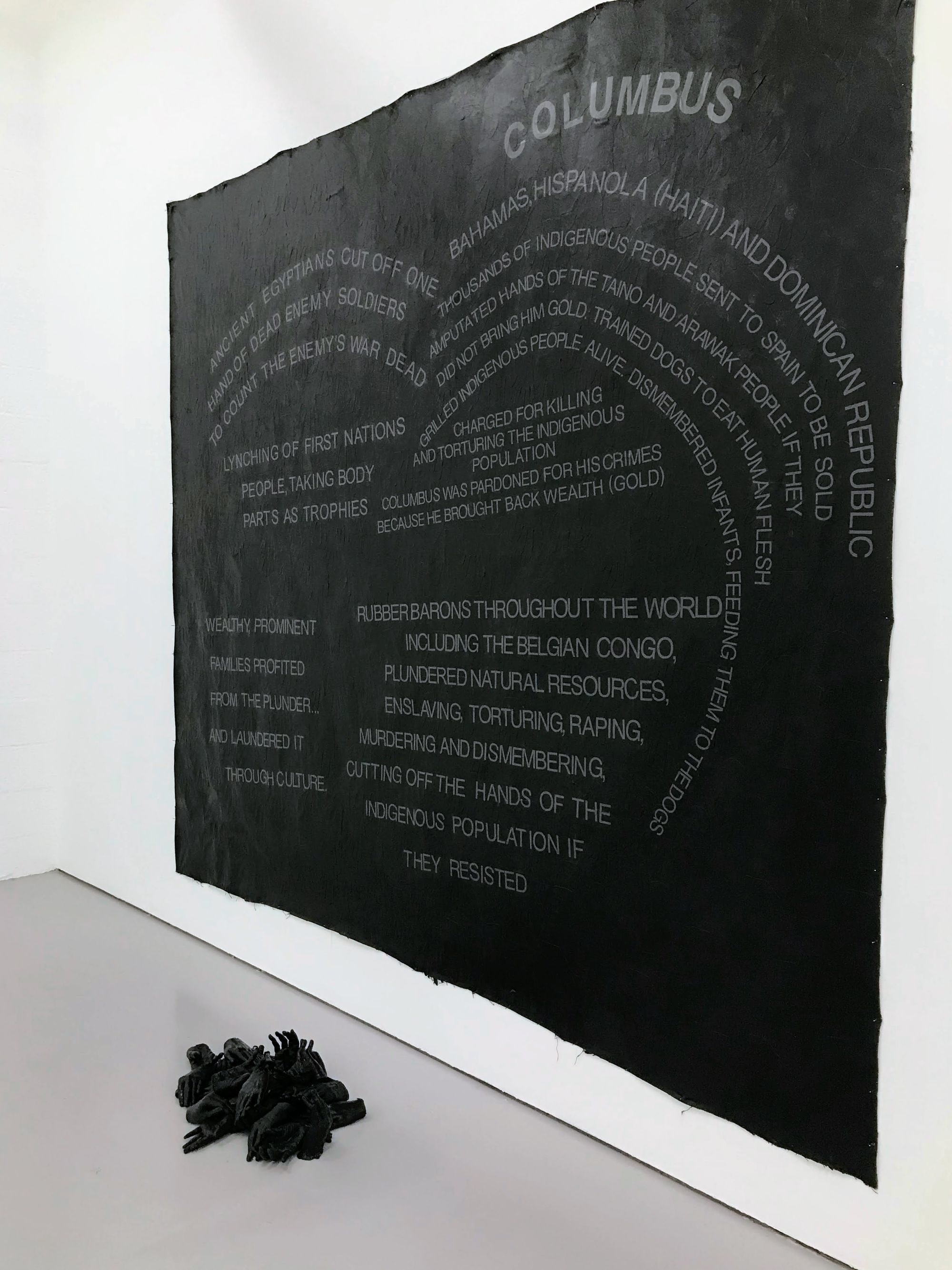 In this examination of the past and present, Pindell explores the ways that black bodies carry the generationally traumatic legacy of imperialism and slavery. Columbus collages black hands and text onto canvas, describing the atrocities committed in the name of wealth and empire. These horrific acts become twisted in a raw encounter between then and now, illustrating how this lure of profit, wealth and privilege has become embedded in structures and institutions, built on oppression and violence.