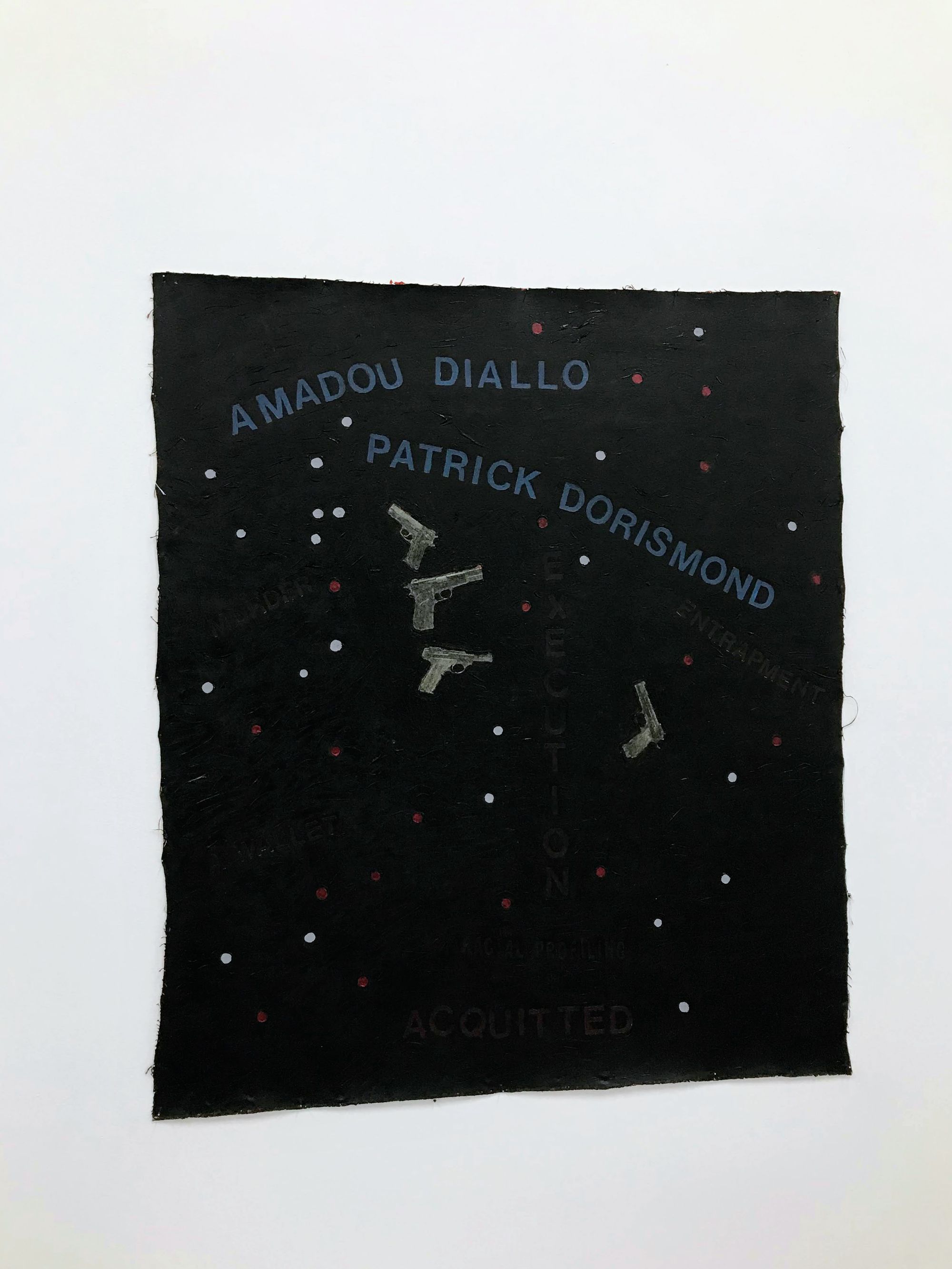 This is most apparent in Diallo. The title refers to the fatal shooting of innocent and unarmed 23-year-old Amadou Diollo by four NYPD officers in 1999. It is a story that is easily and sadly recognisable. The red and white dots on the canvas indicate the forty-one shots fired, against a seething black darkness.
