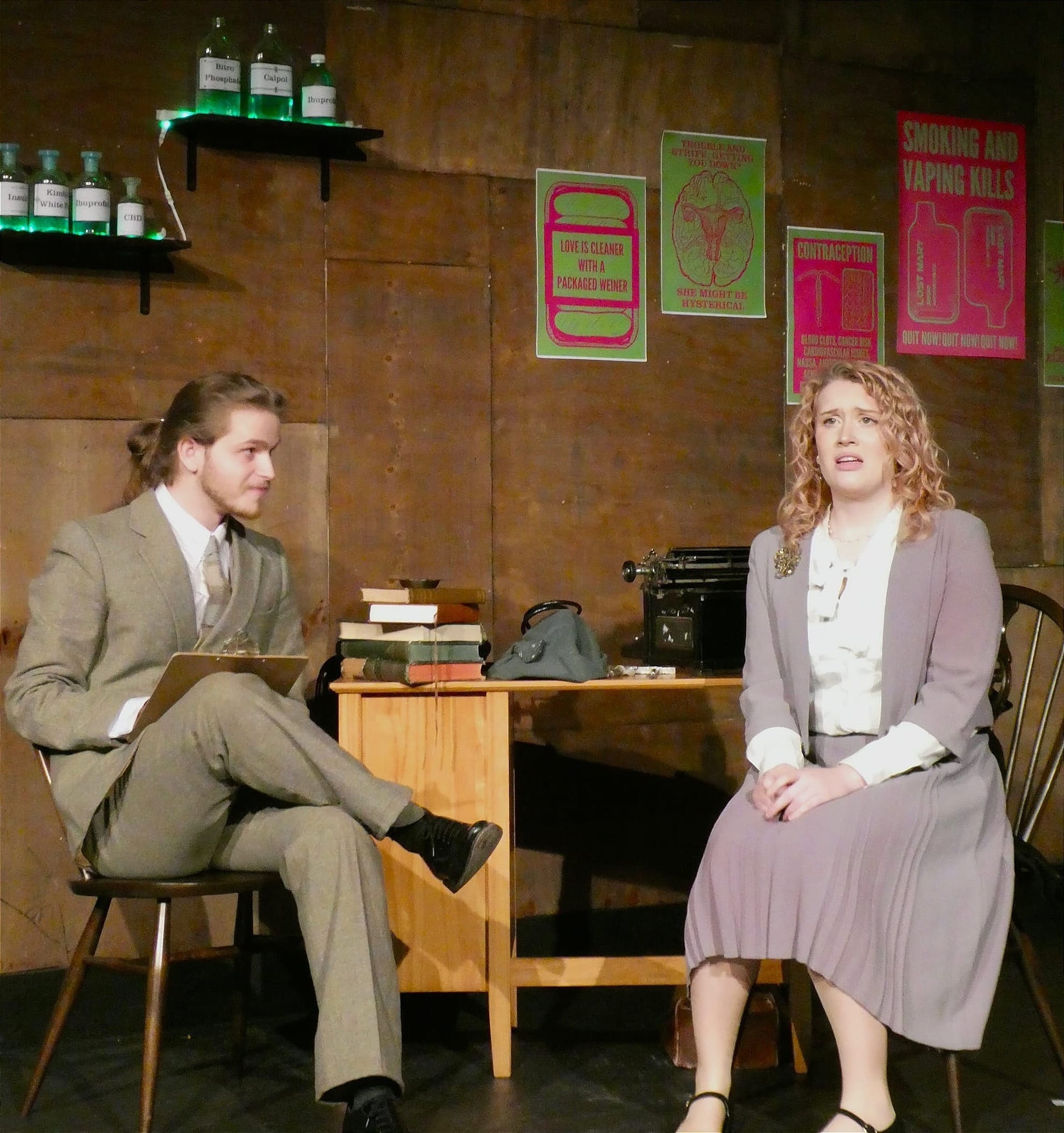 Seating in The Wardrobe Theatre wraps around the stage, and lighting spills into the front rows, drawing the audience into the waiting room with the actors. The production moves briskly between the two timelines on a split stage, the set mirrored almost exactly on either side: same desk, chairs and setup, only a computer where the typewriter once sat. What begins as a neat visual device gradually feels more pointed and the similarities feel like a warning.